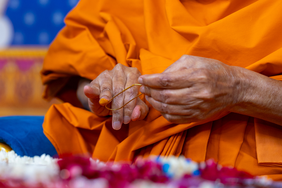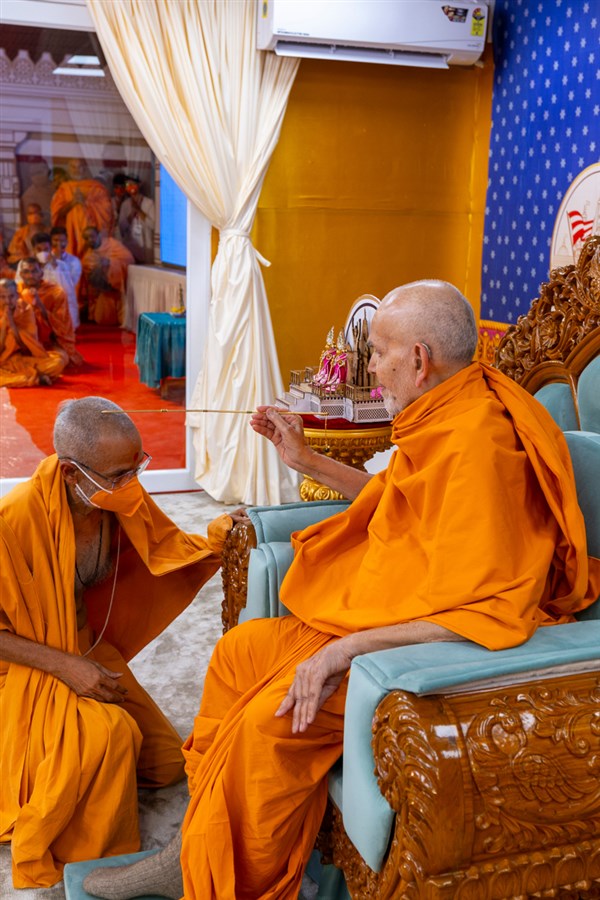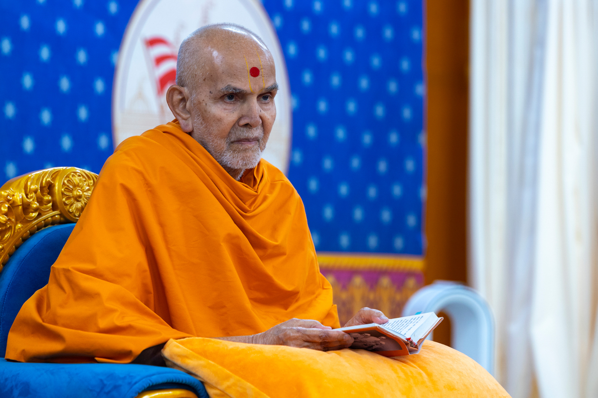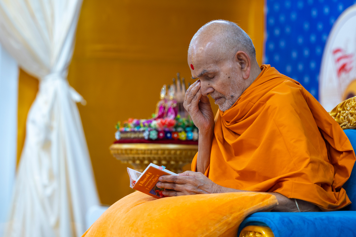 Swamishri listens to the sadhana mantra and daily prayer