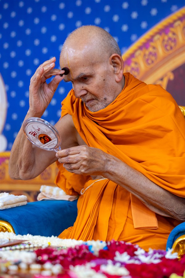 Swamishri applies chandan on a tilakiyu