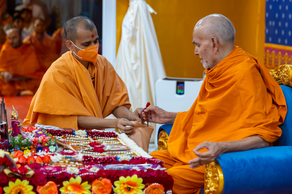 Swamishri prepares to turn the mala in his daily puja