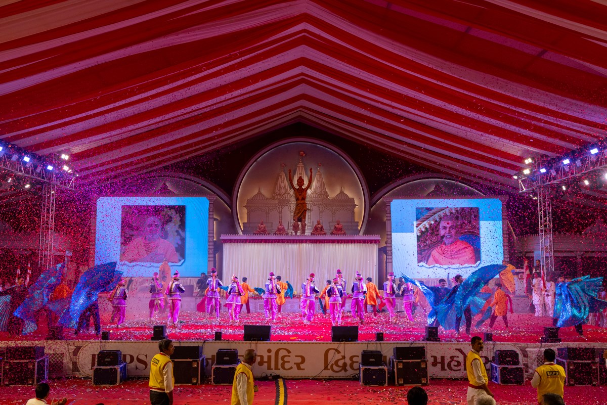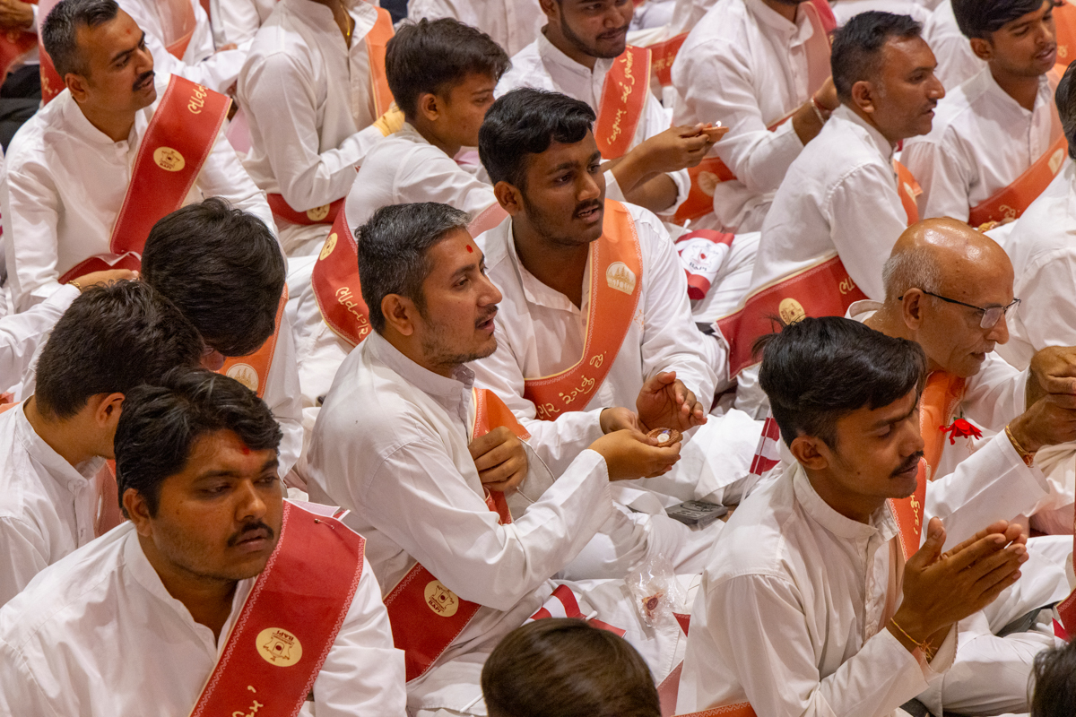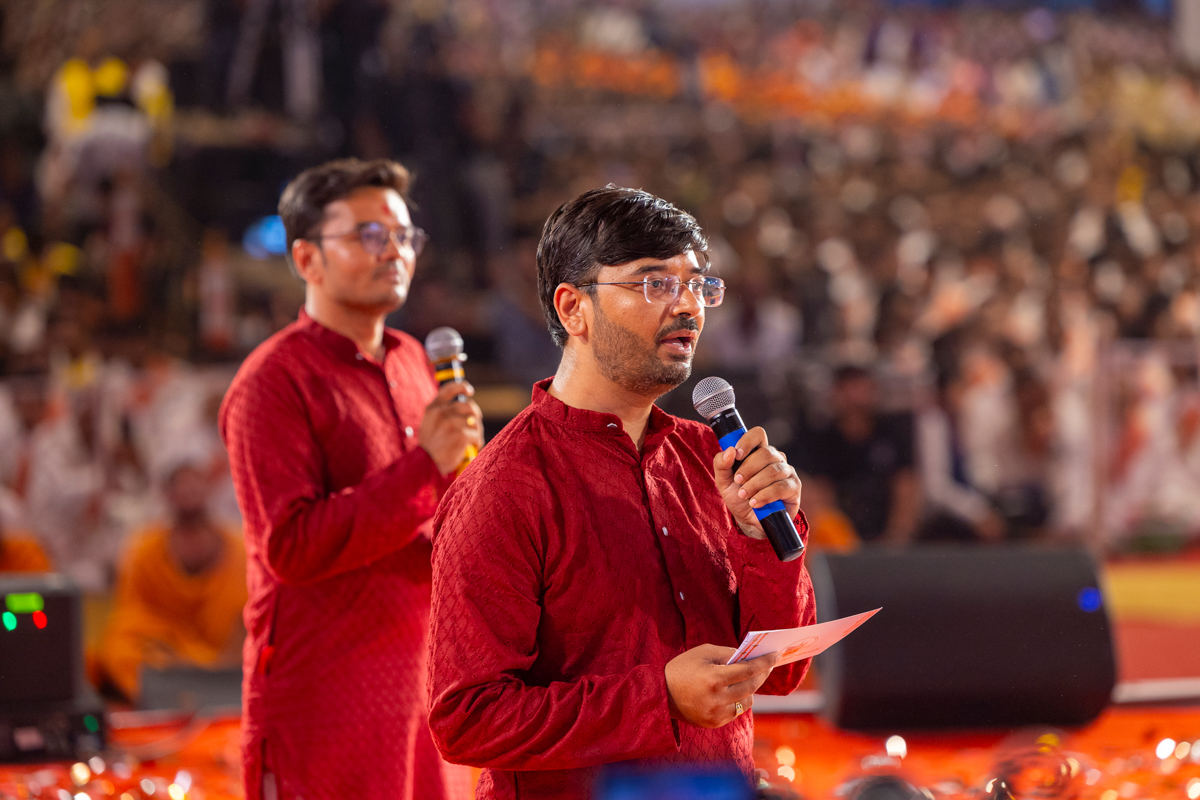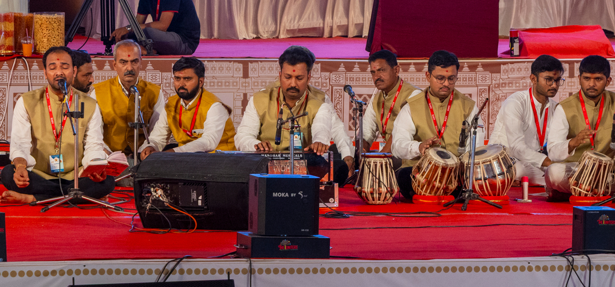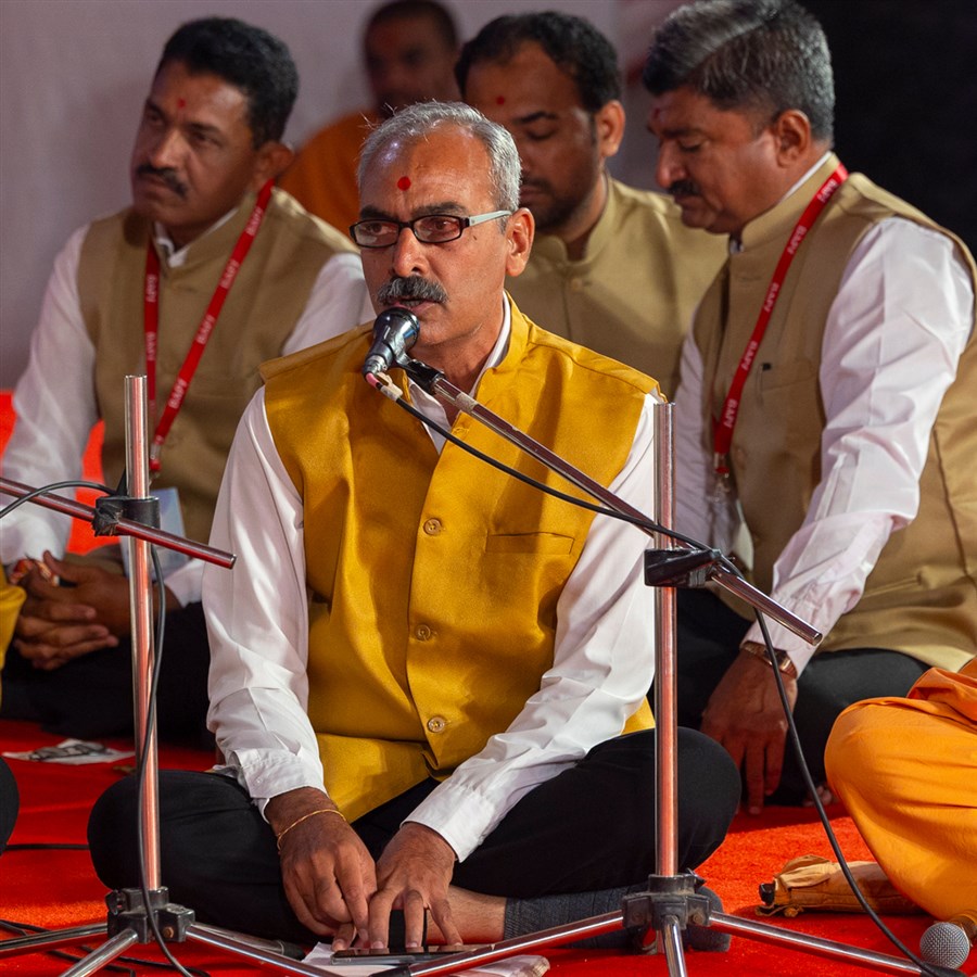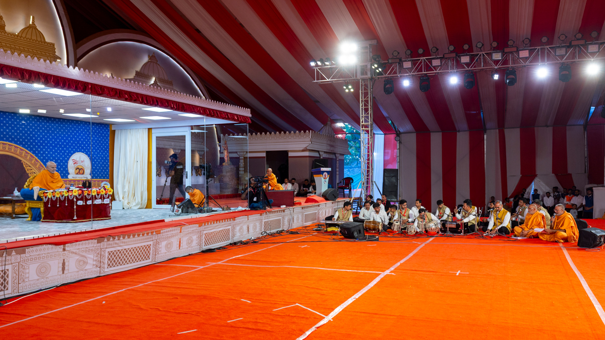 Devotees sing kirtans at the beginning of the symbolic celebration assembly of Bhavnagar Mandir Dwidashabdi Mahotsav in the evening