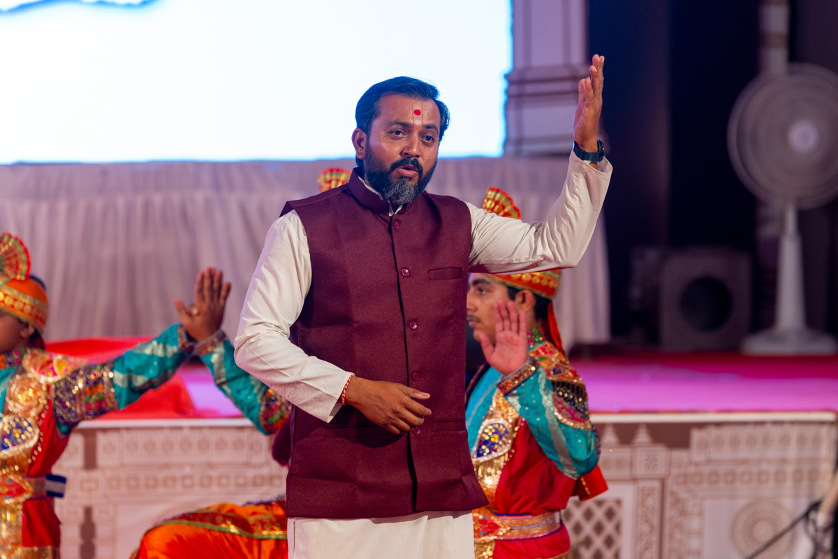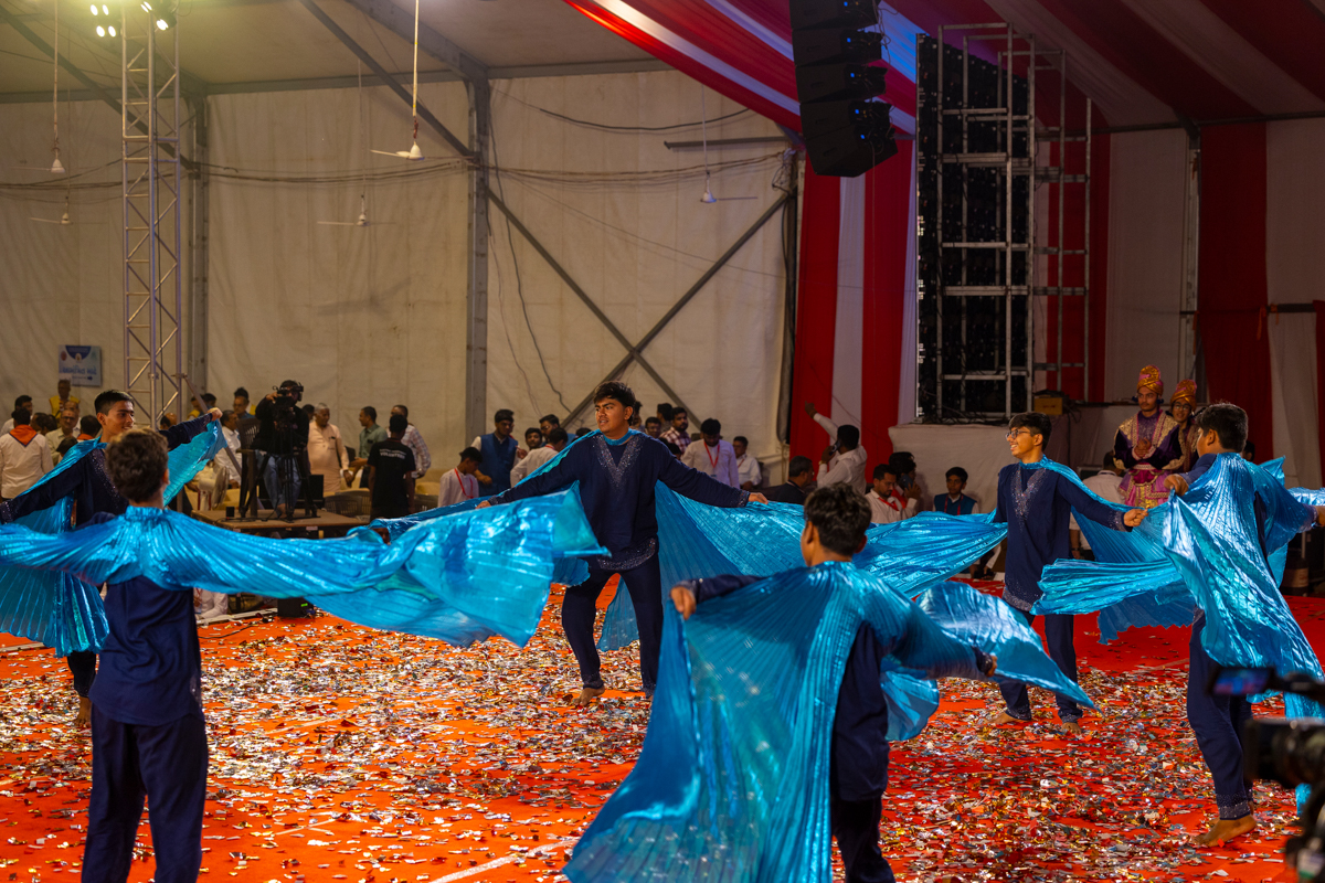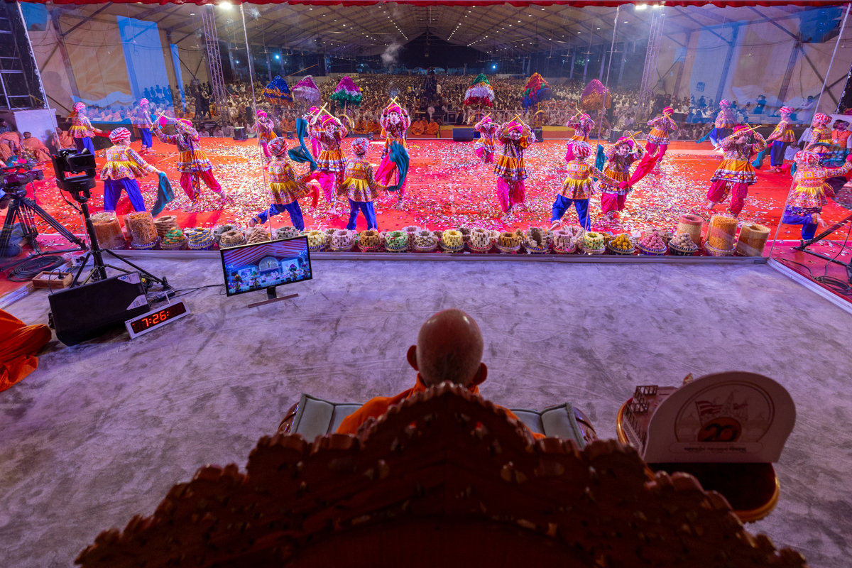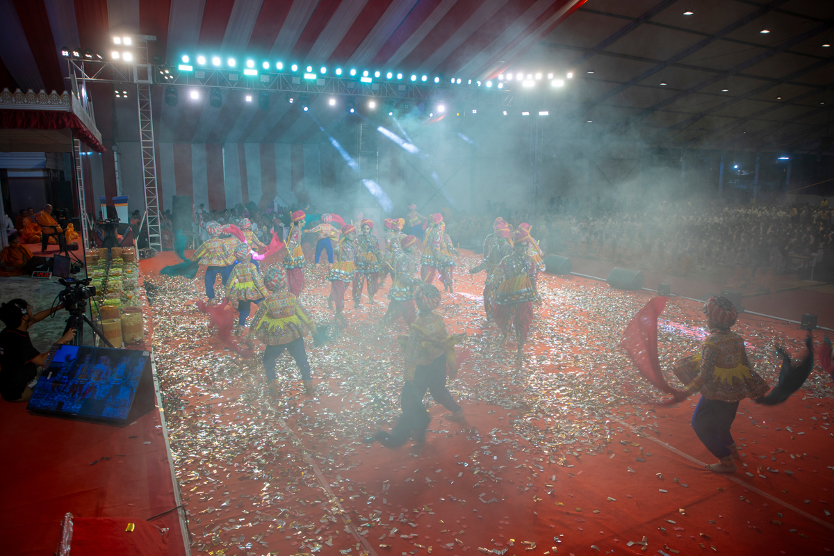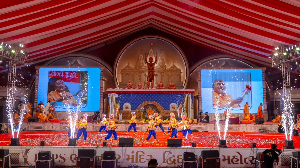 Devotees sing kirtans at the beginning of the symbolic celebration assembly of Bhavnagar Mandir Dwidashabdi Mahotsav in the evening