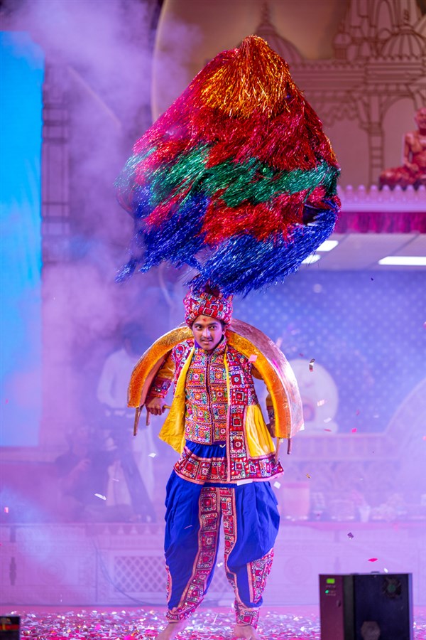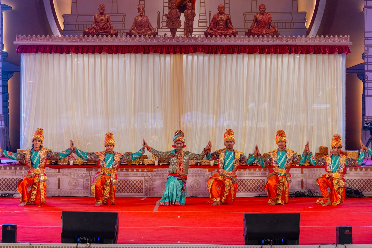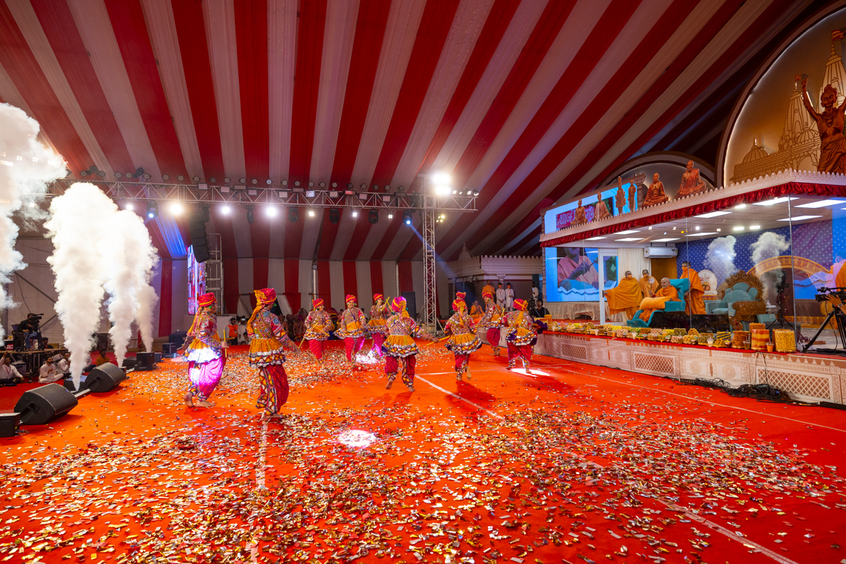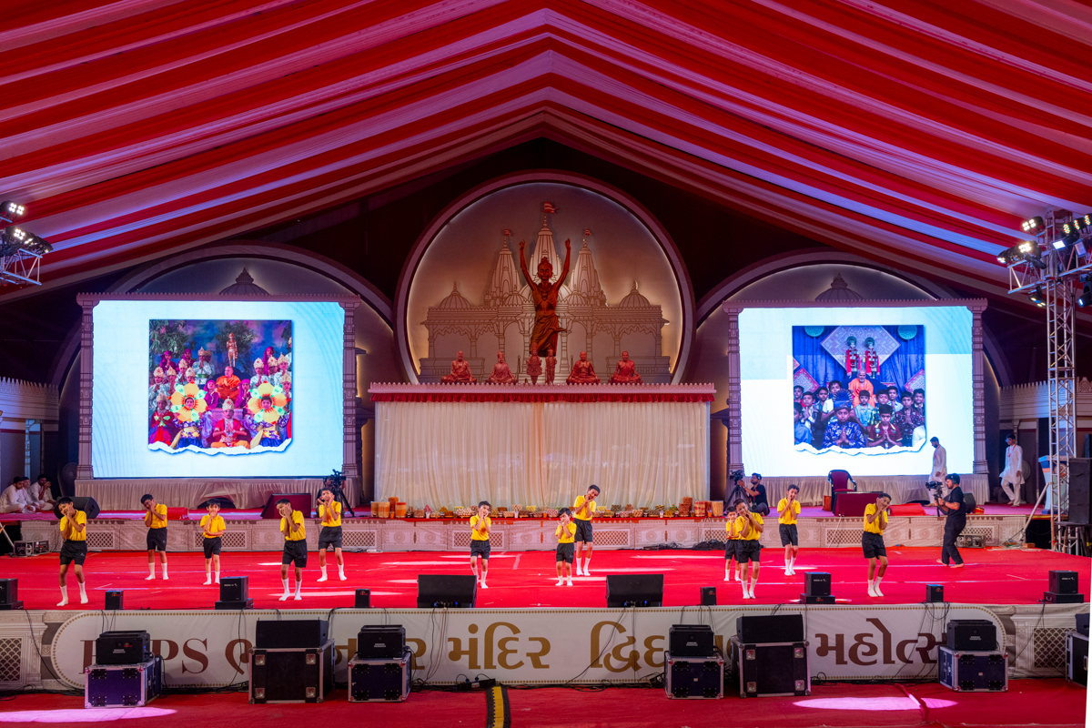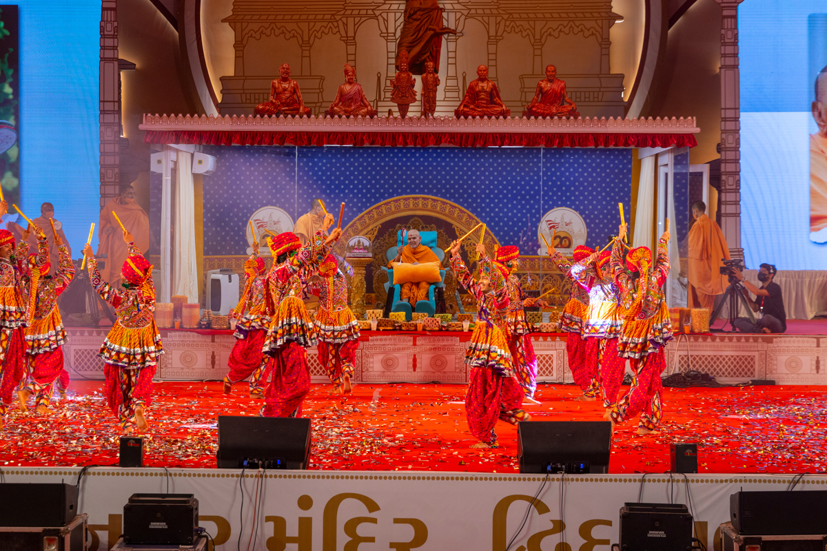 Devotees sing kirtans at the beginning of the symbolic celebration assembly of Bhavnagar Mandir Dwidashabdi Mahotsav in the evening