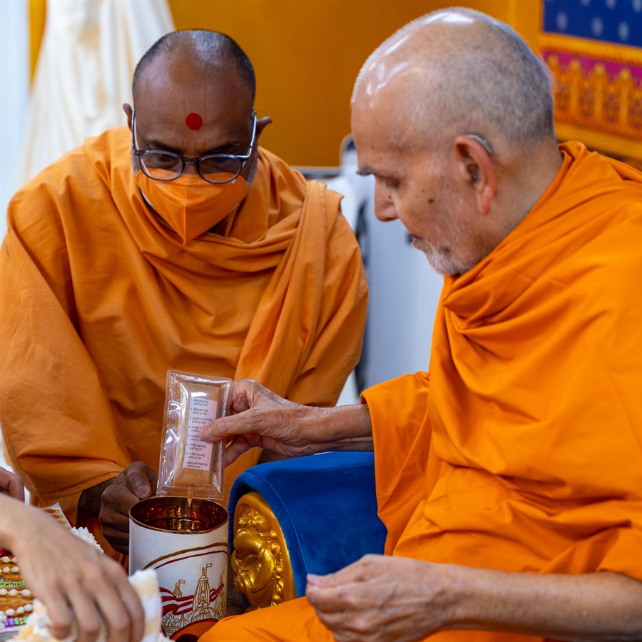 Swamishri sanctifies water with the holy relics of Bhagwan Swaminarayan and the Guru Parampara