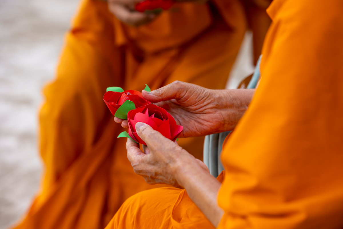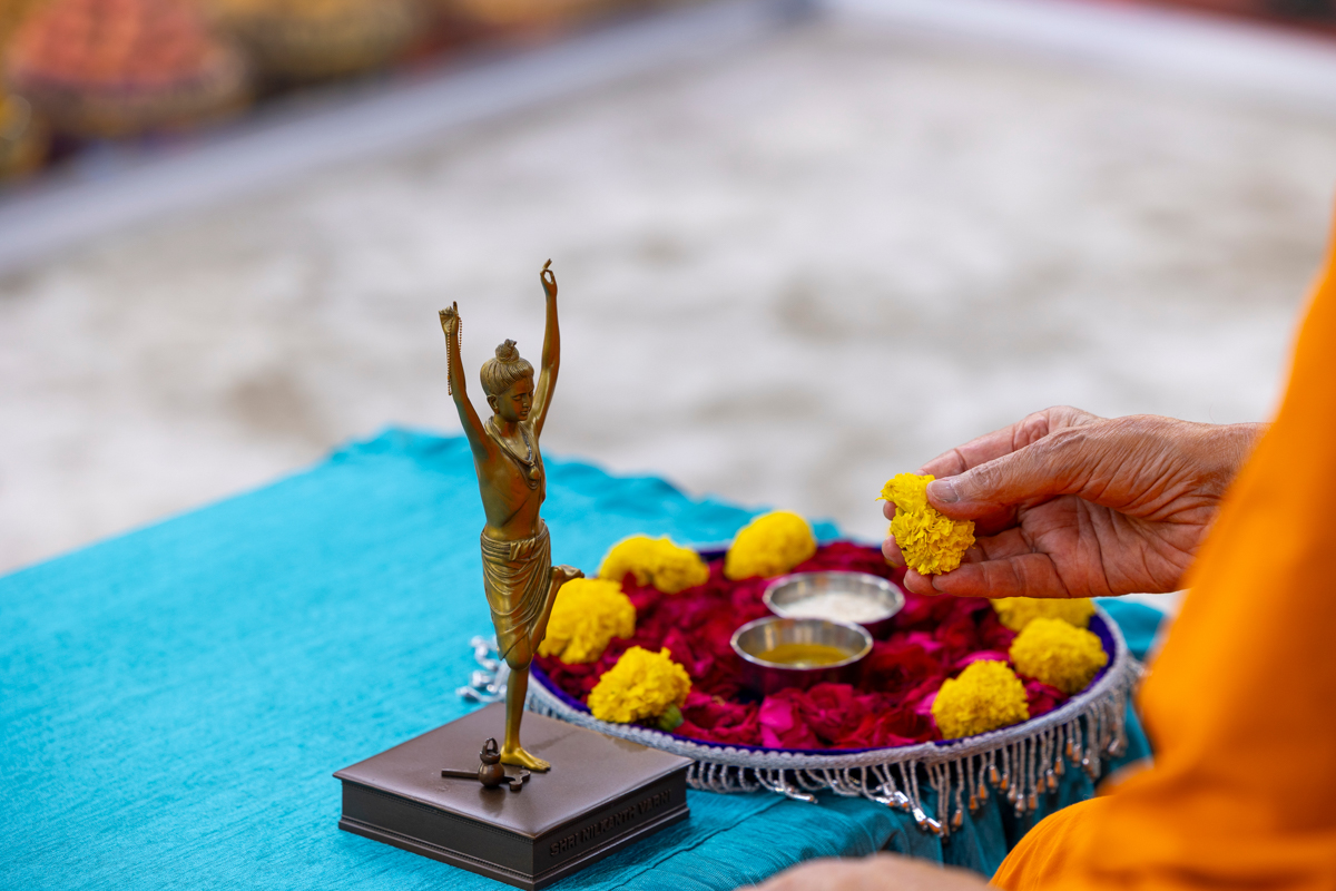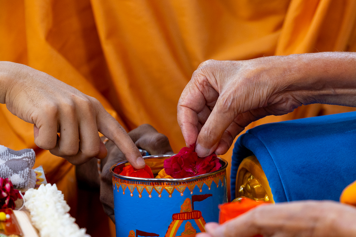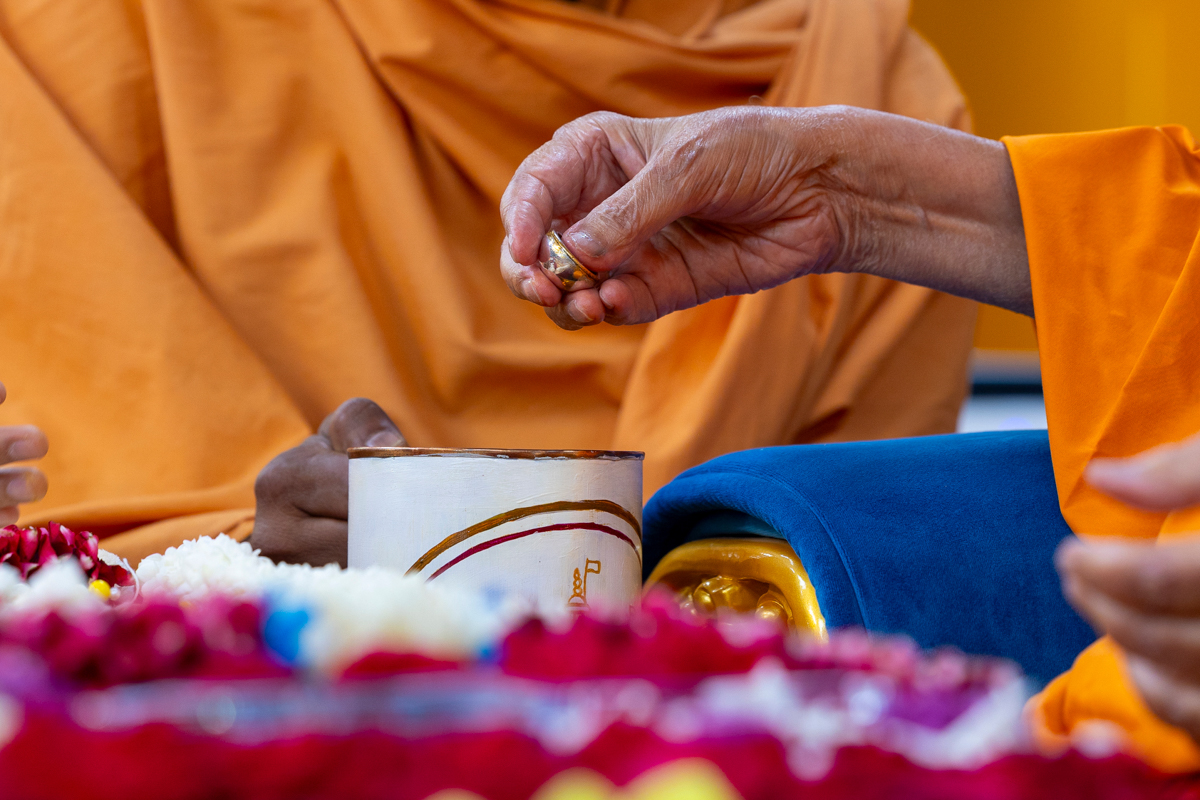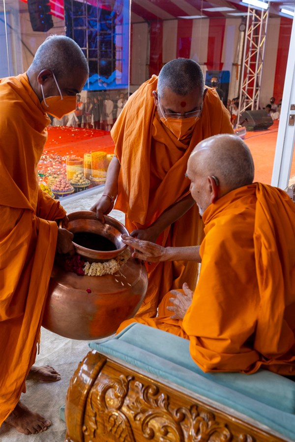 Swamishri adds flowers to the sanctified water