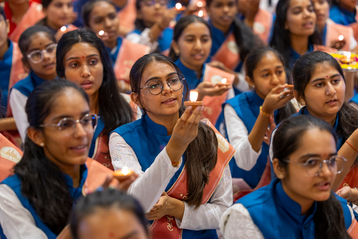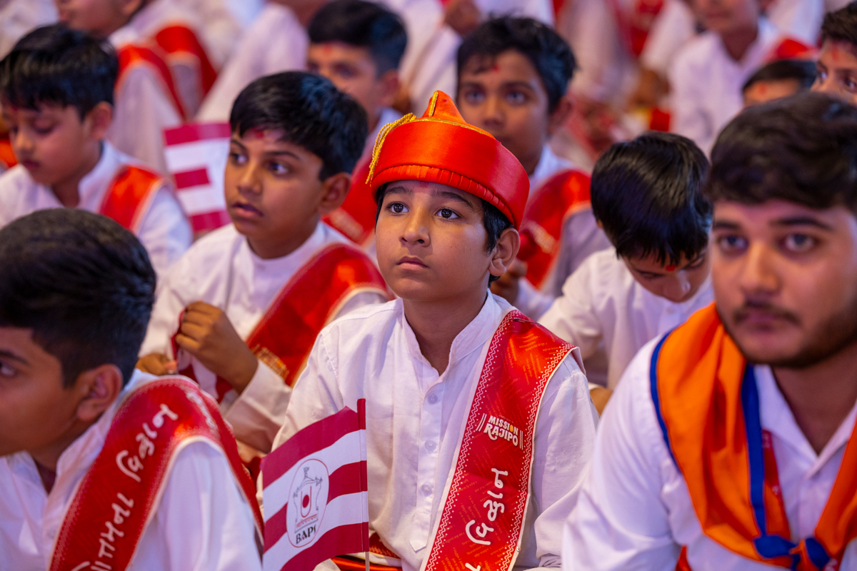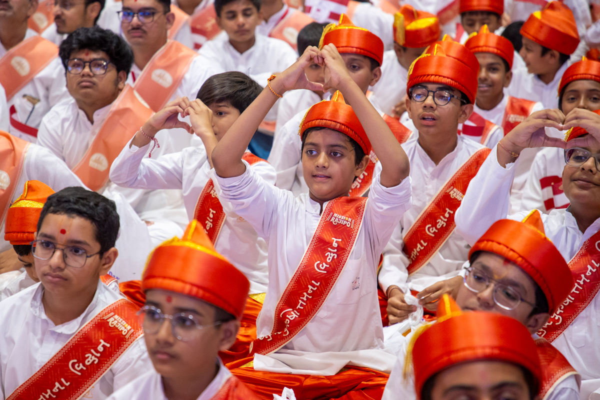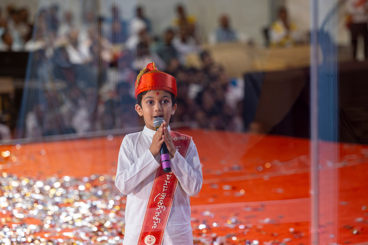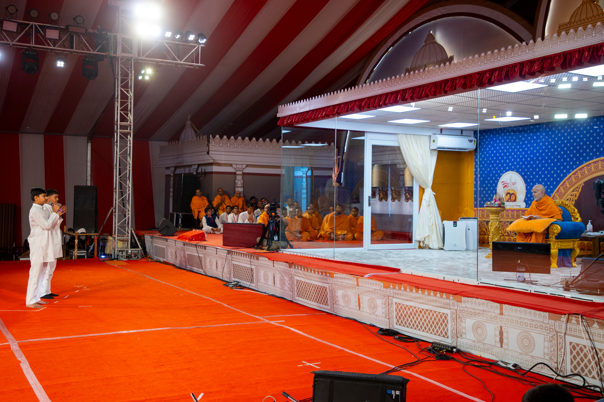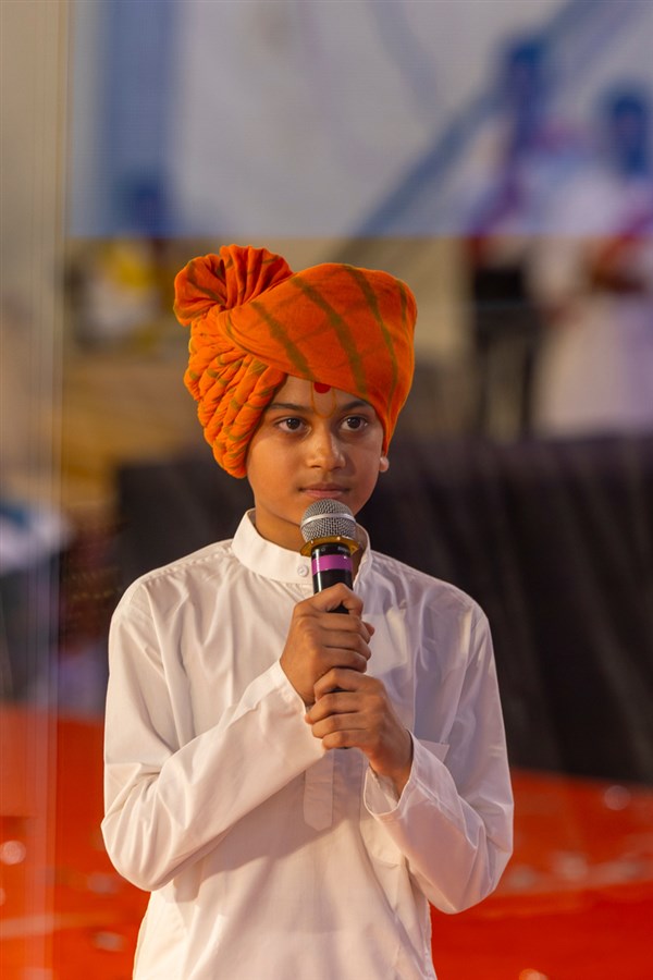 Balaks lead everyone in reciting the sadhana mantra and daily prayer in Swamishri's puja