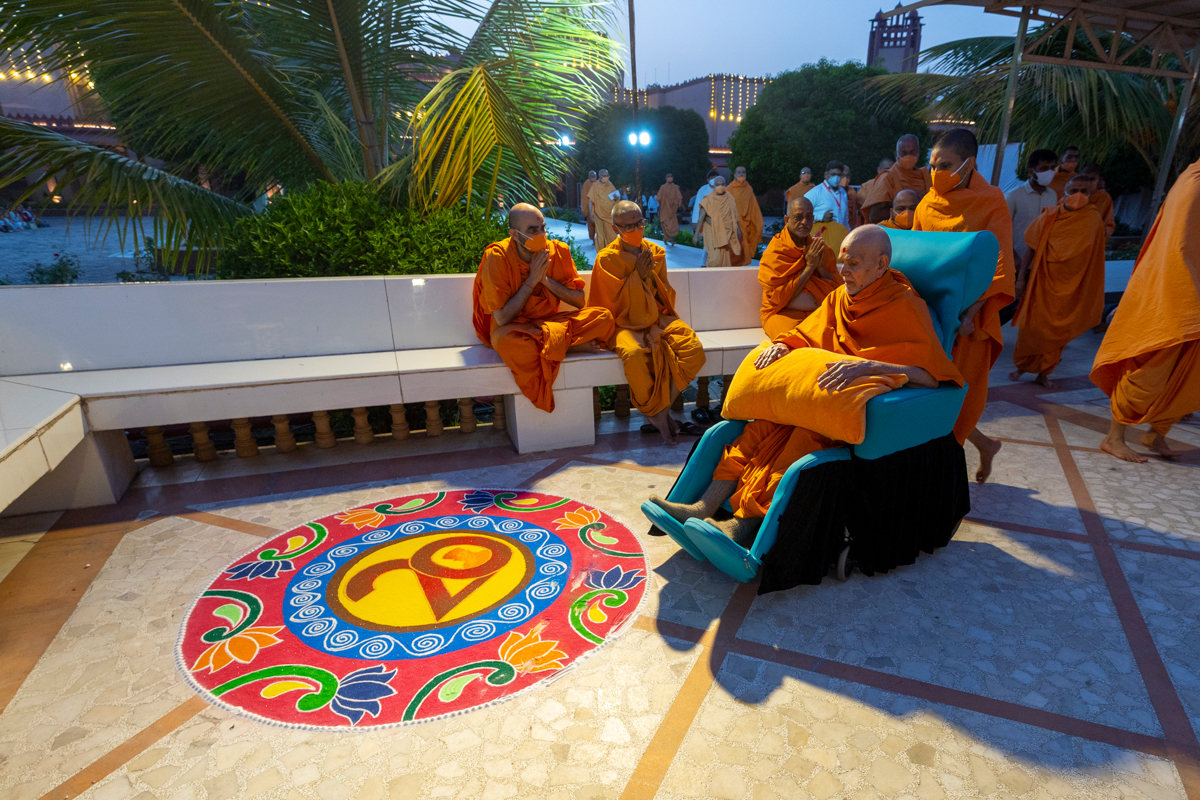 Swamishri observes a rangoli