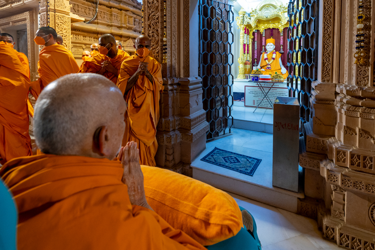 Pujya Ghanshyamcharan Swami and swamis doing darshan of Swamishri