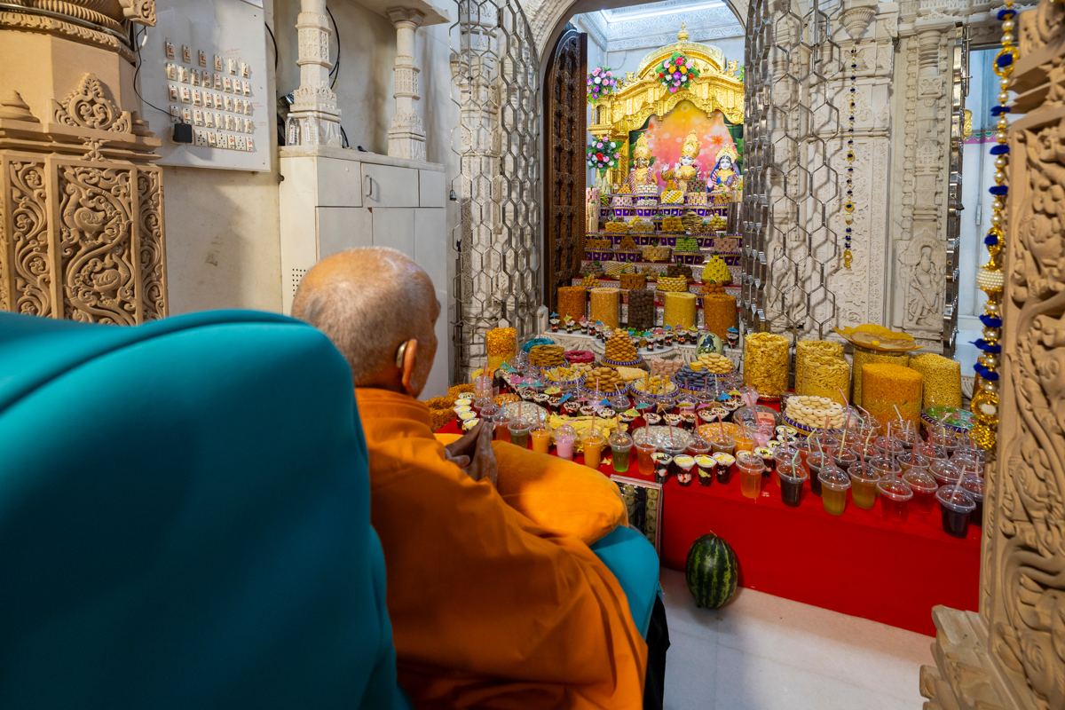 Swamishri engrossed in darshan of Shri Harikrishna Maharaj and Shri Radha-Krishna Bhagwan