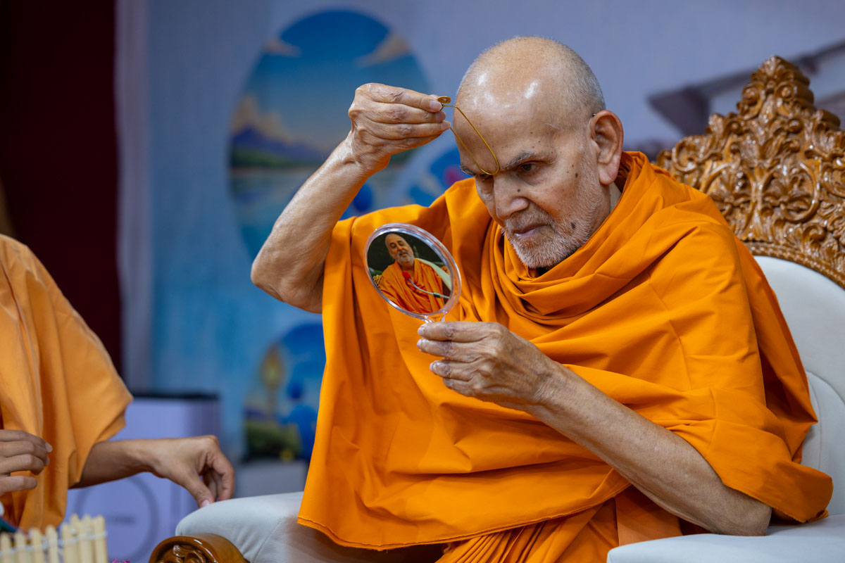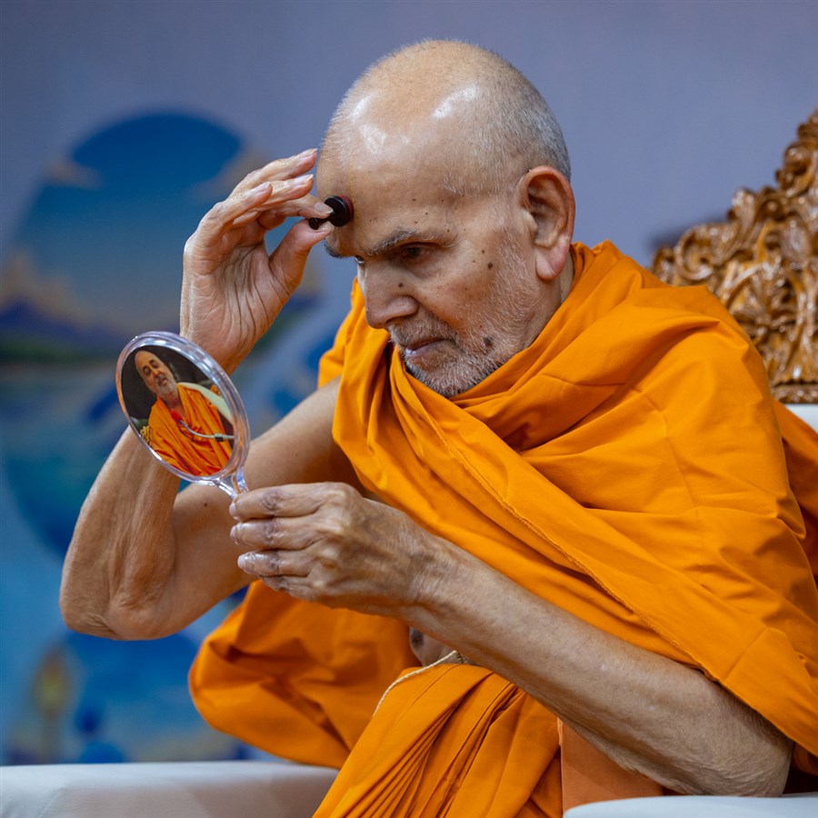 Swamishri applies a tilak on his forehead