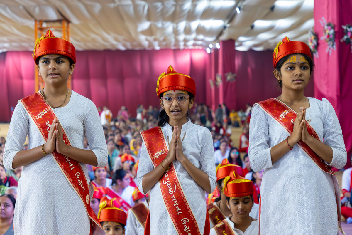 Students from BAPS Swaminarayan Vidyamandir, Atladara (Vadodara), doing Swamishri's puja darshan