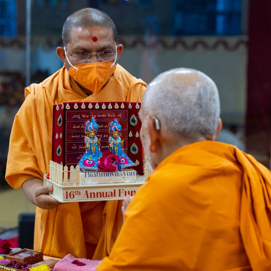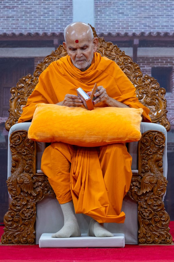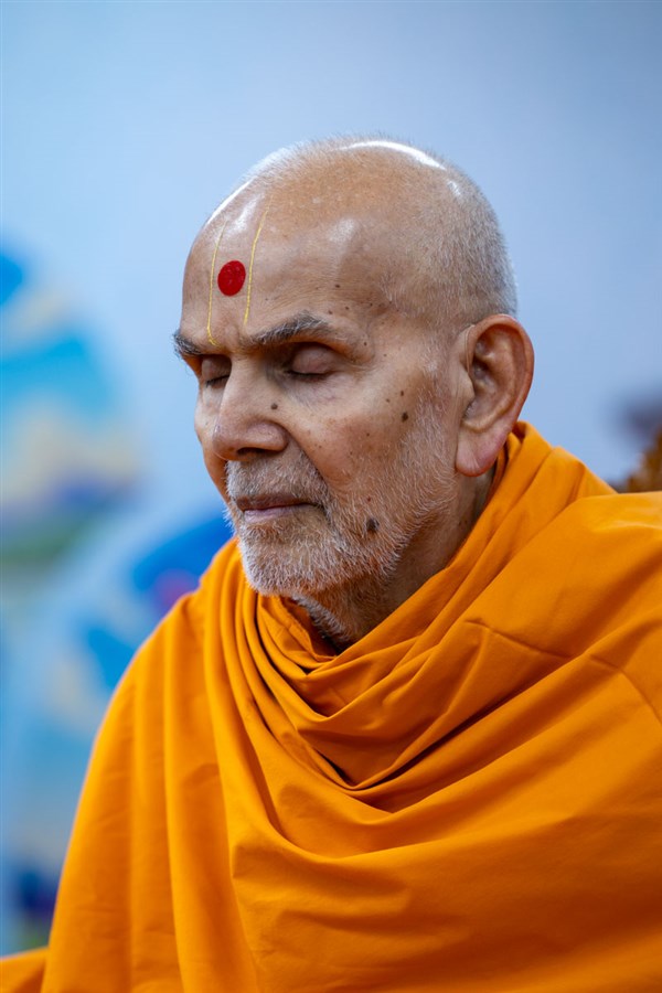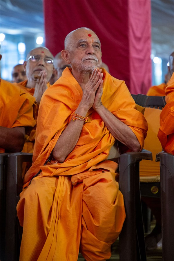 Swamishri listens to the sadhana mantra and daily prayer