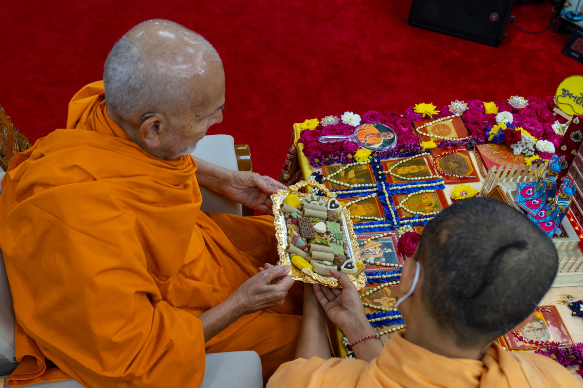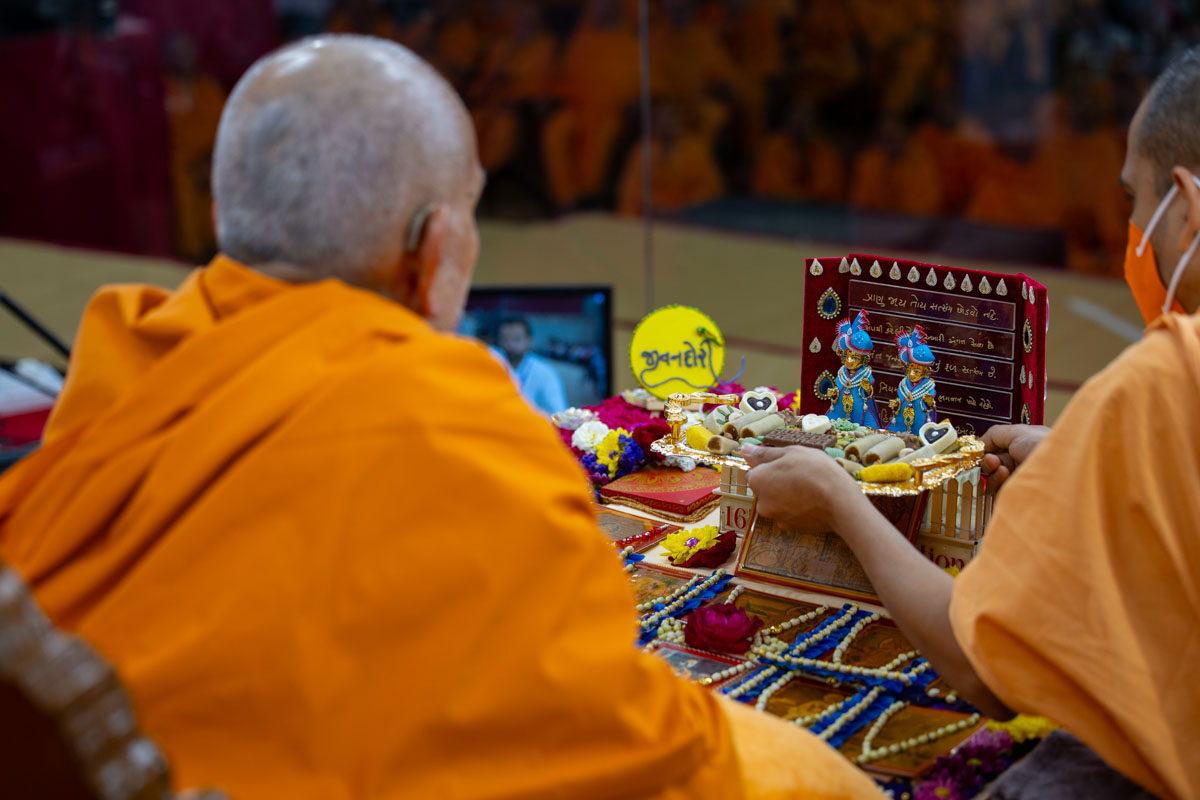 Swamishri offers thal to Brahmaswarup Pramukh Swami Maharaj