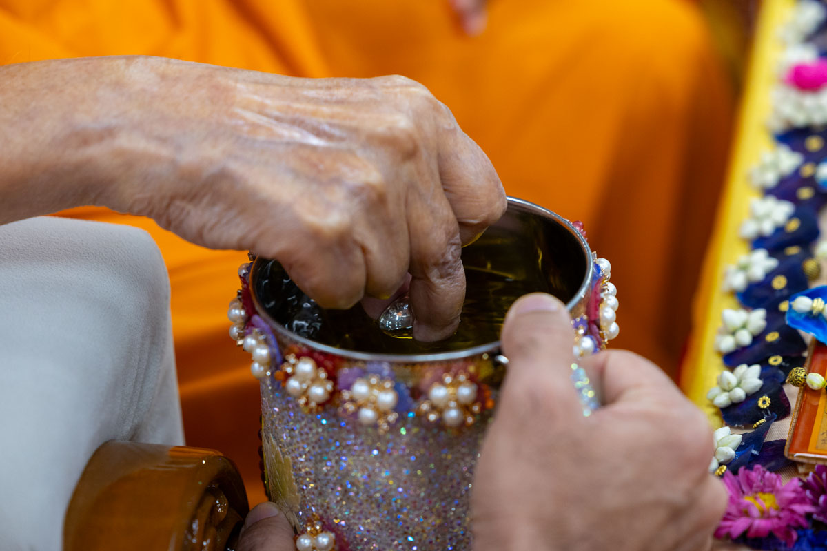 Swamishri sanctifies water with the holy relics of Bhagwan Swaminarayan and the Guru Parampara