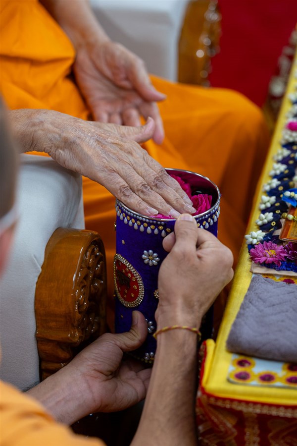 Swamishri adds flowers to the sanctified water