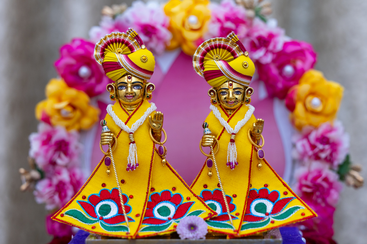 Param Pujya Mahant Swami Maharaj engrossed in darshan of Shri Harikrishna Maharaj and Shri Gunatitanand Swami Maharaj