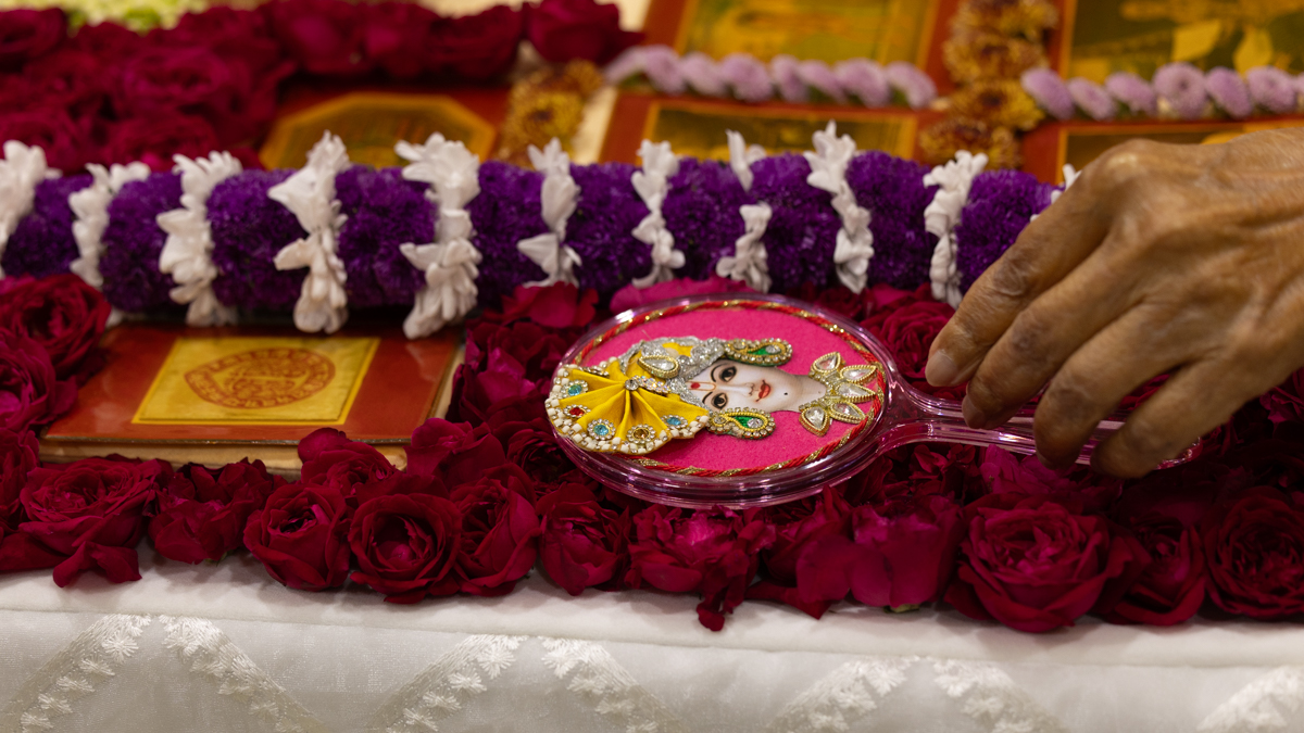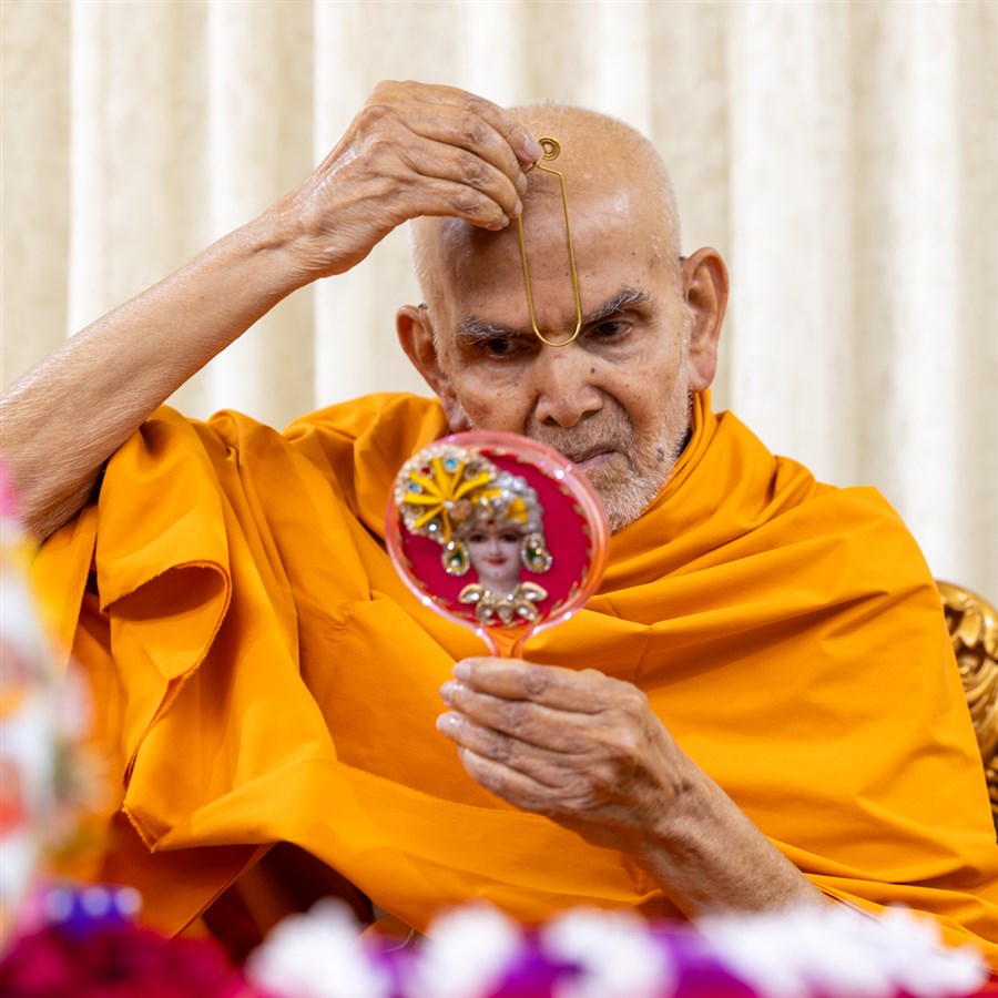 Swamishri adjusts the mirror in his daily puja