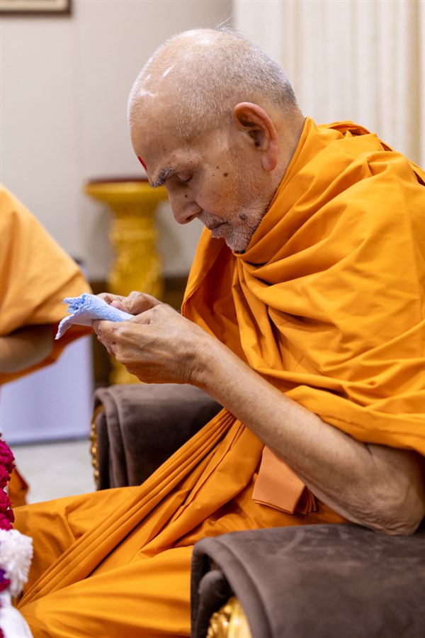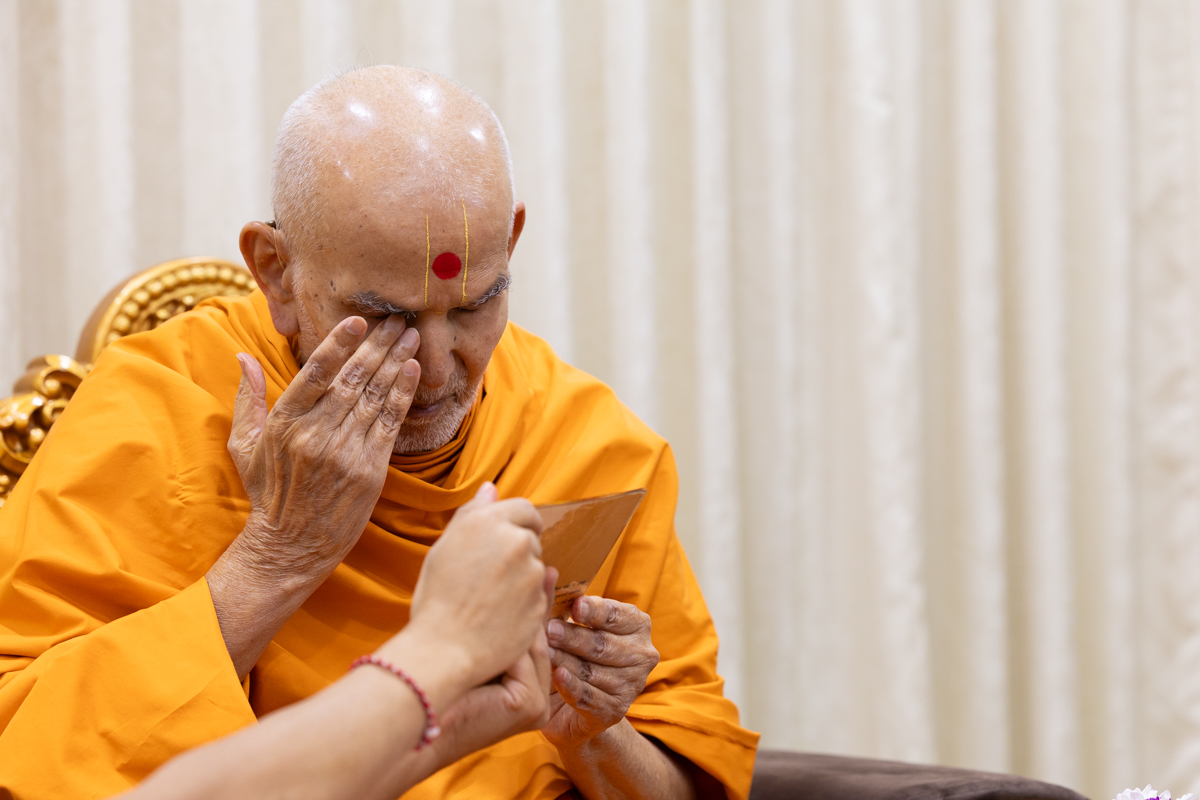 Swamishri clears loose kumkum from his forehead