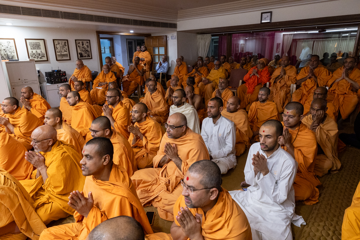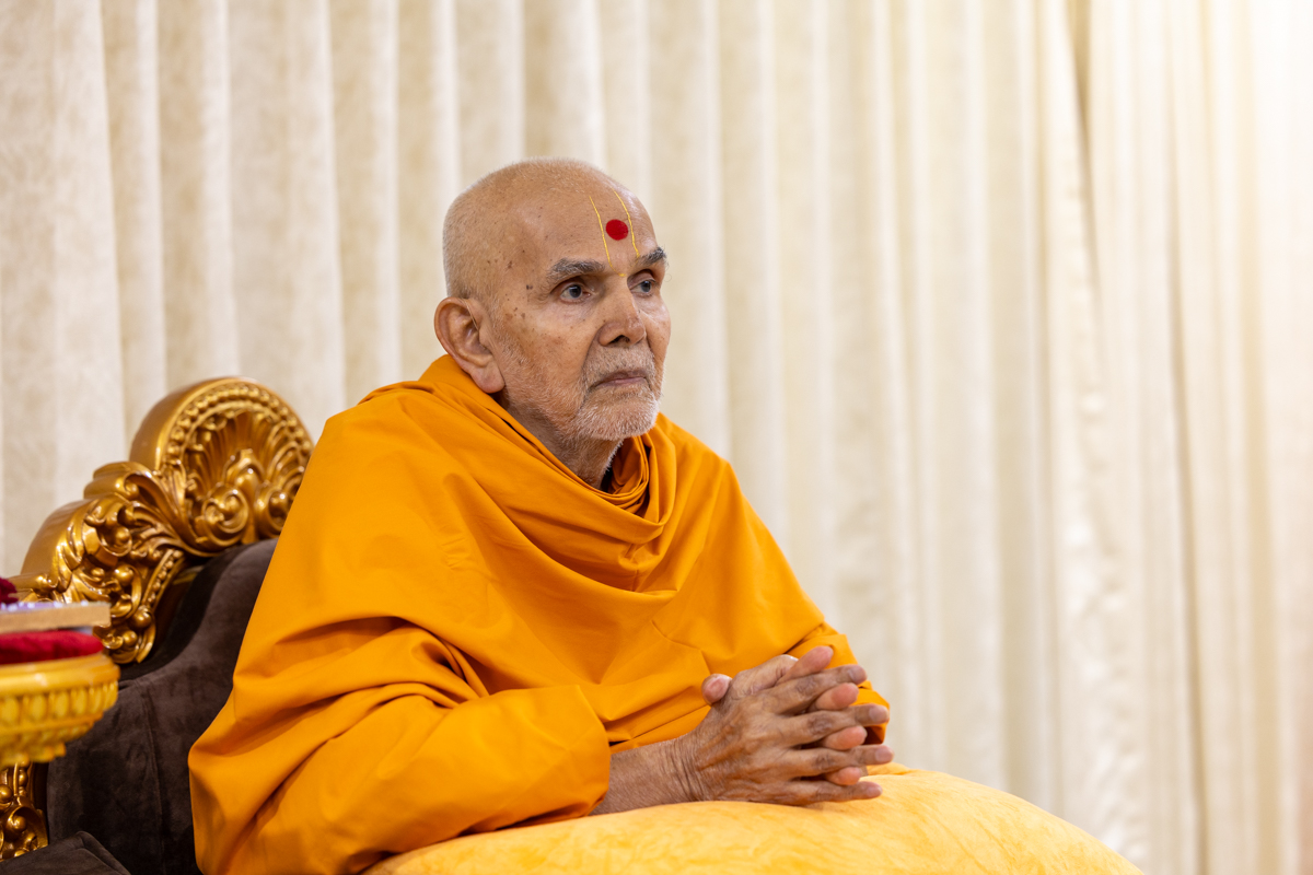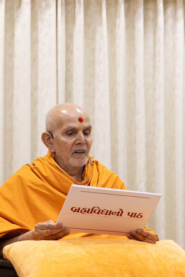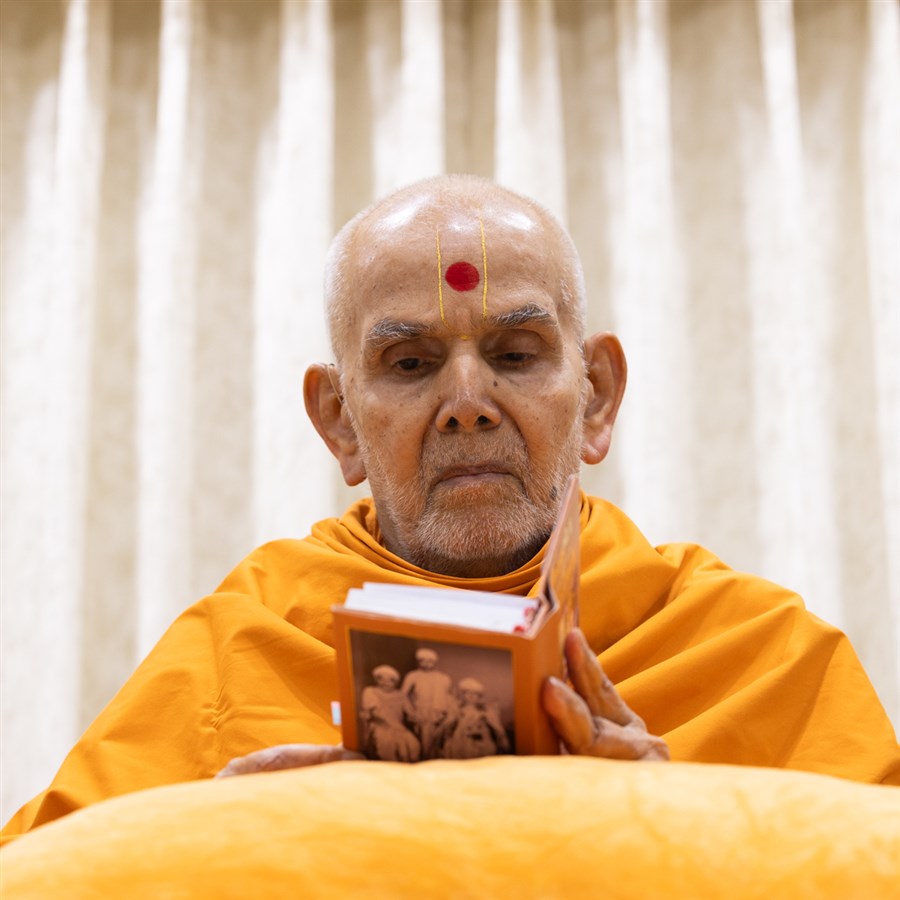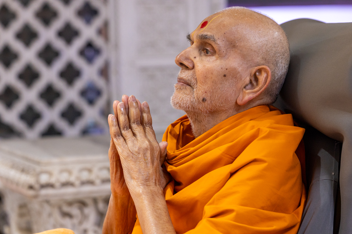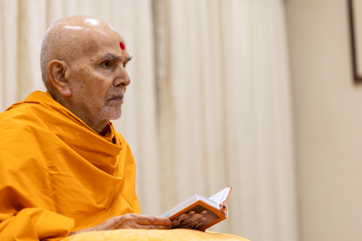 Swamishri listens to the sadhana mantra and daily prayer