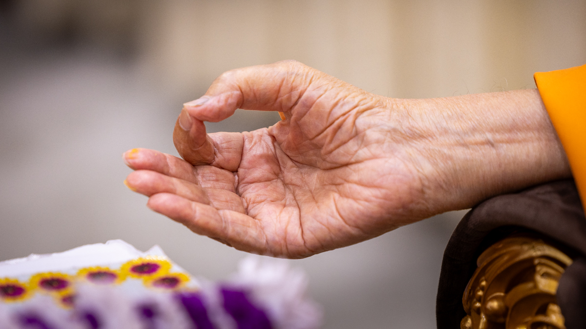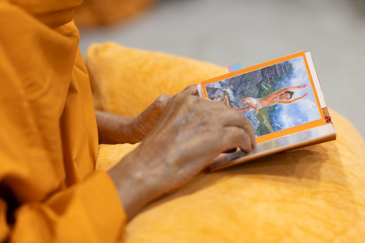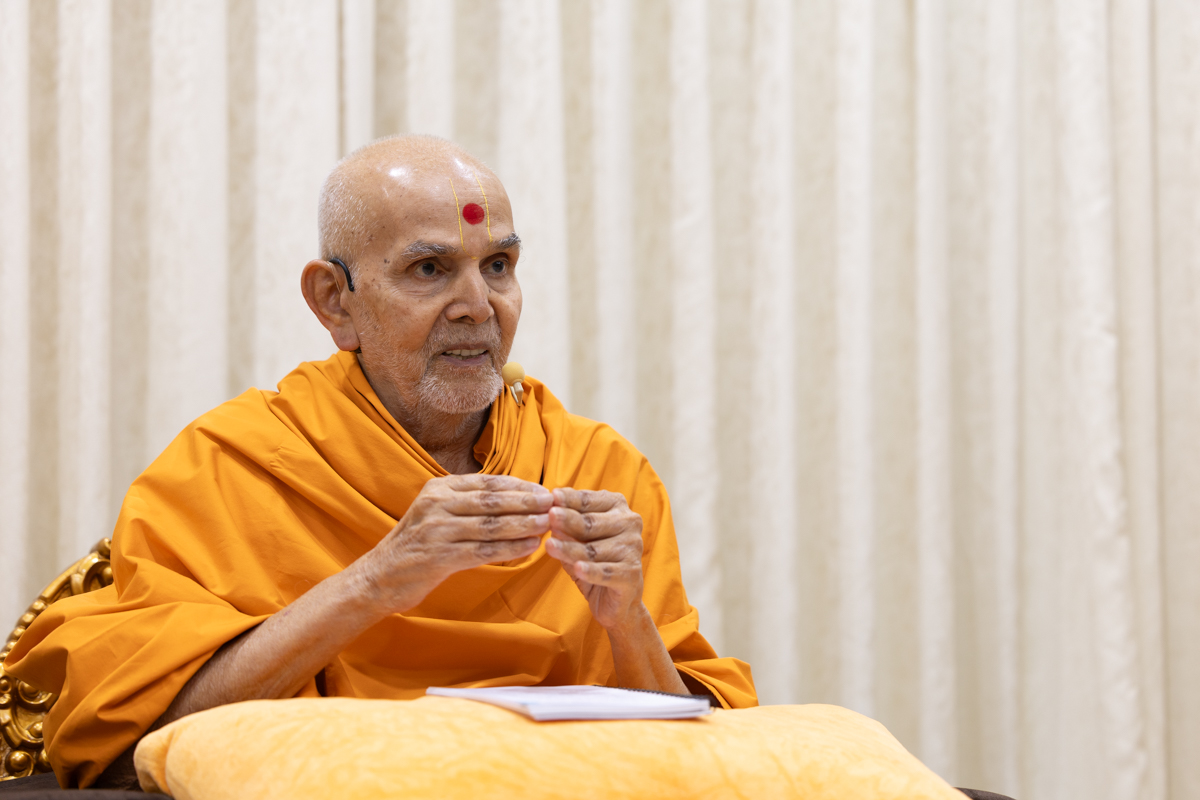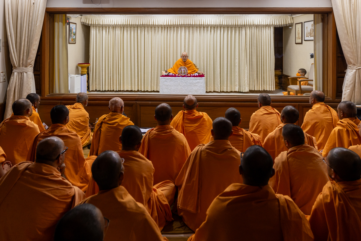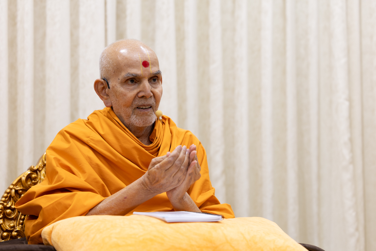 Swamishri listens to the sadhana mantra and daily prayer