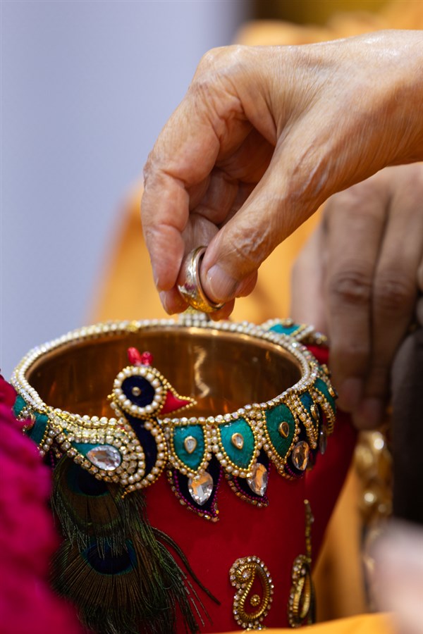 Swamishri sanctifies water with the holy relics of Bhagwan Swaminarayan and the Guru Parampara