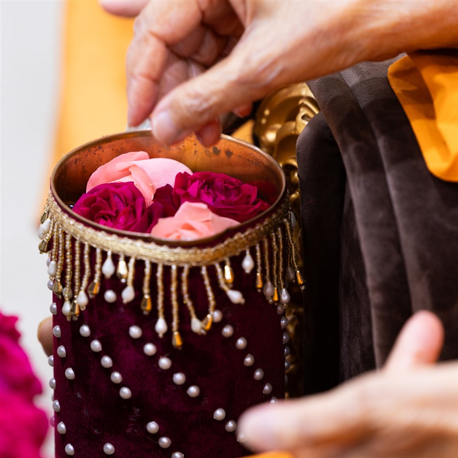Swamishri adds flowers to the sanctified water