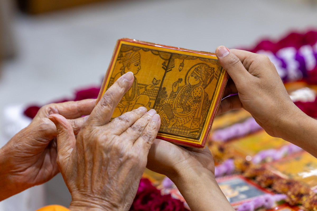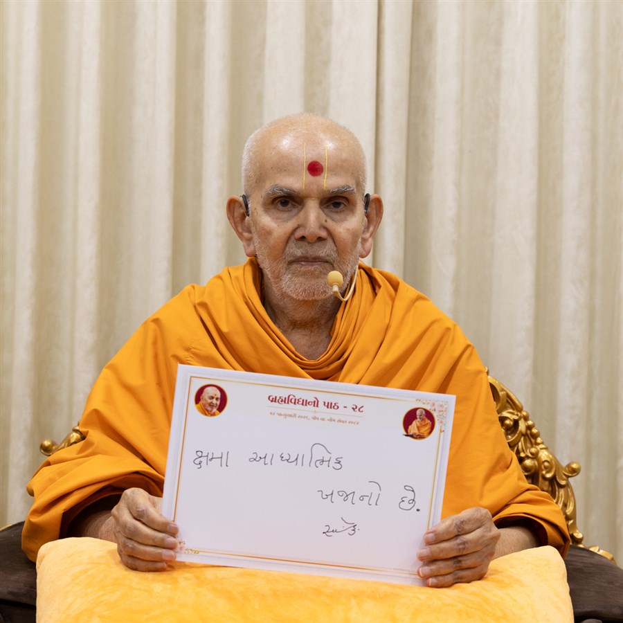Swamishri displays a message for Dhanurmas