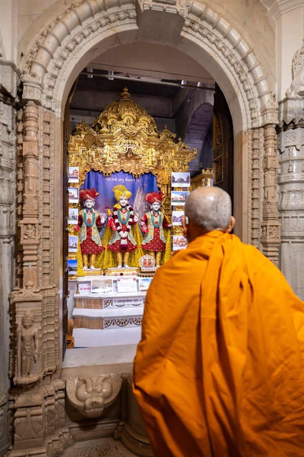 Swamishri engrossed in darshan of Bhagwan Swaminarayan, Aksharbrahma Gunatitanand Swami and Shri Gopalanand Swami