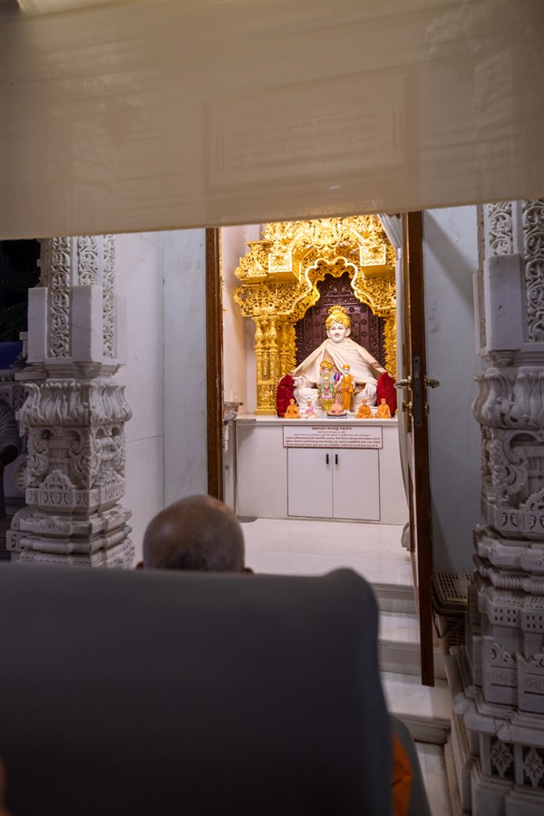 Swamishri engrossed in darshan of Shri Ghanshyam Maharaj in the evening