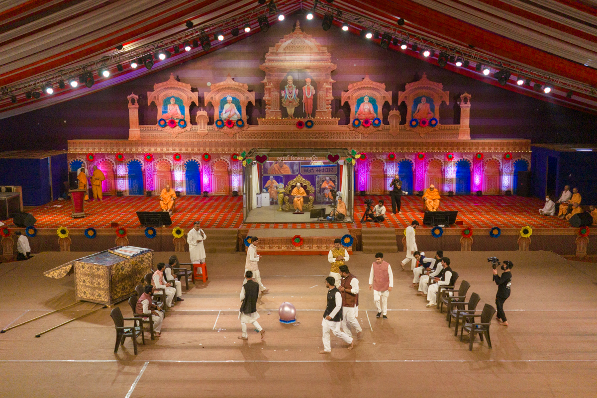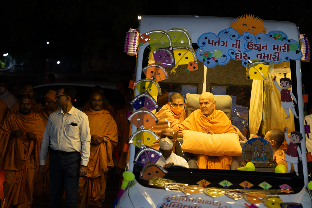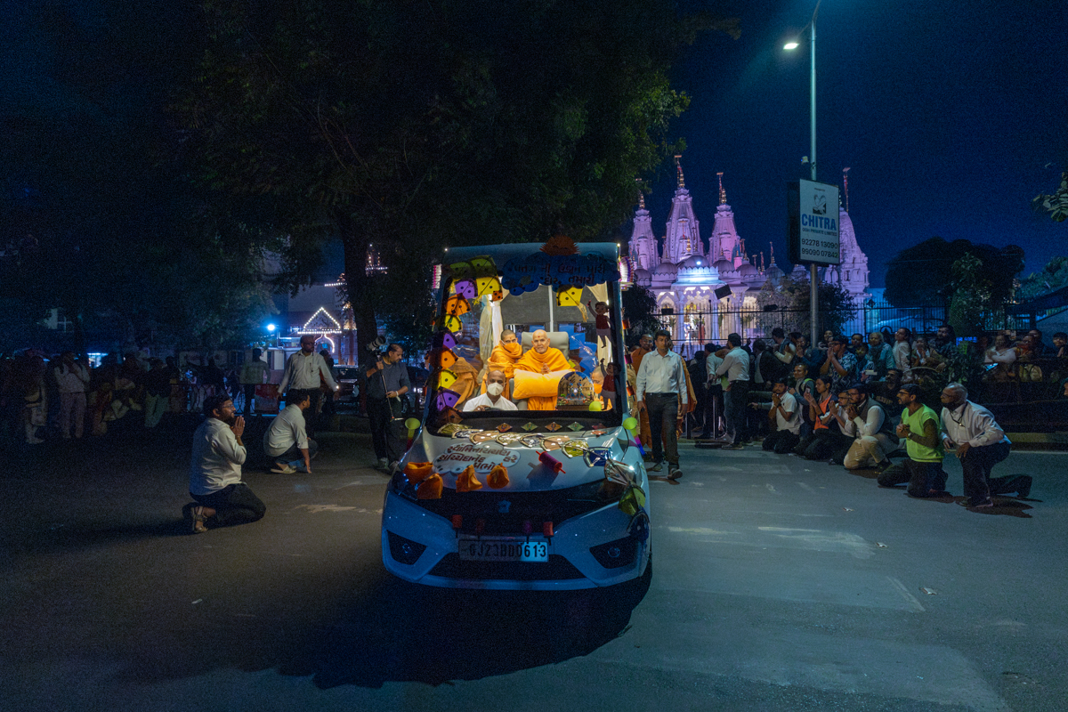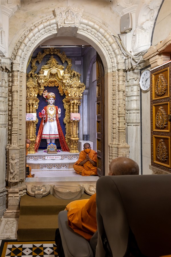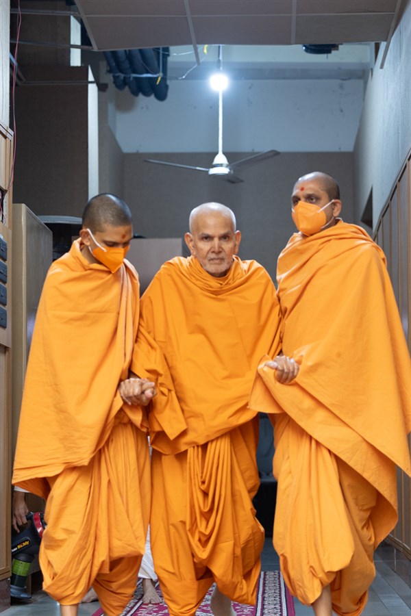 Param Pujya Mahant Swami Maharaj arrives to perform his daily puja