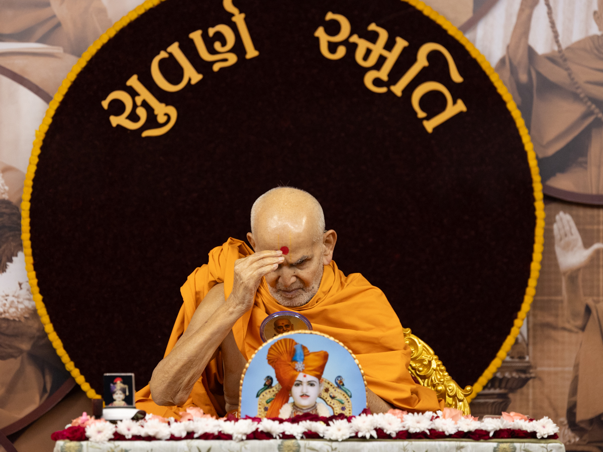 Swamishri applies a tilak on his forehead
