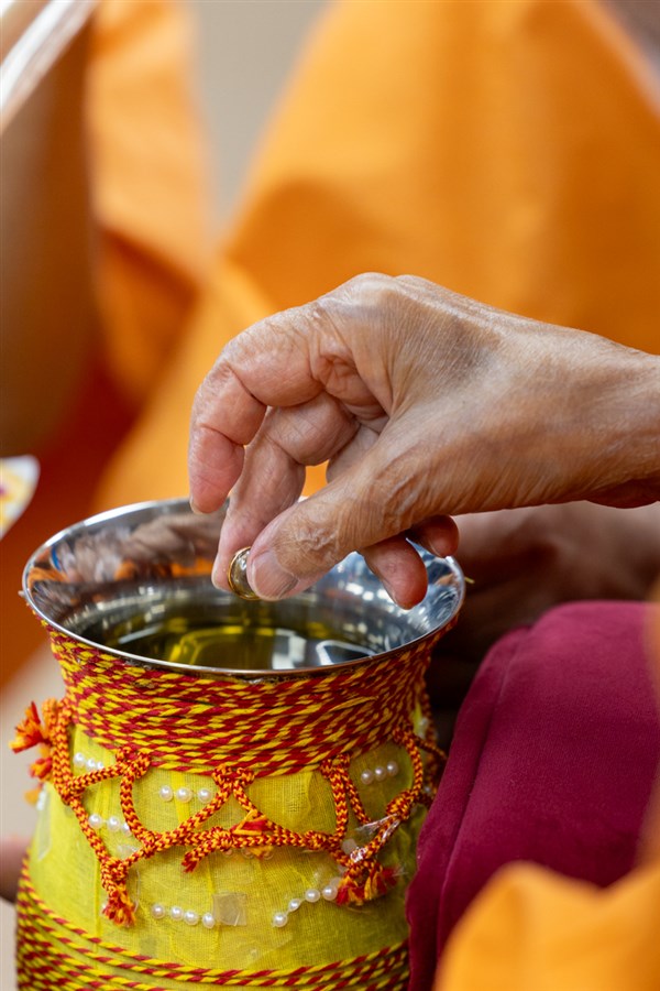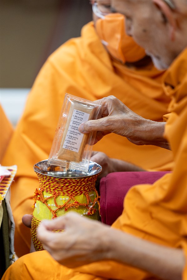 Swamishri sanctifies water with the holy relics of Bhagwan Swaminarayan and the Guru Parampara