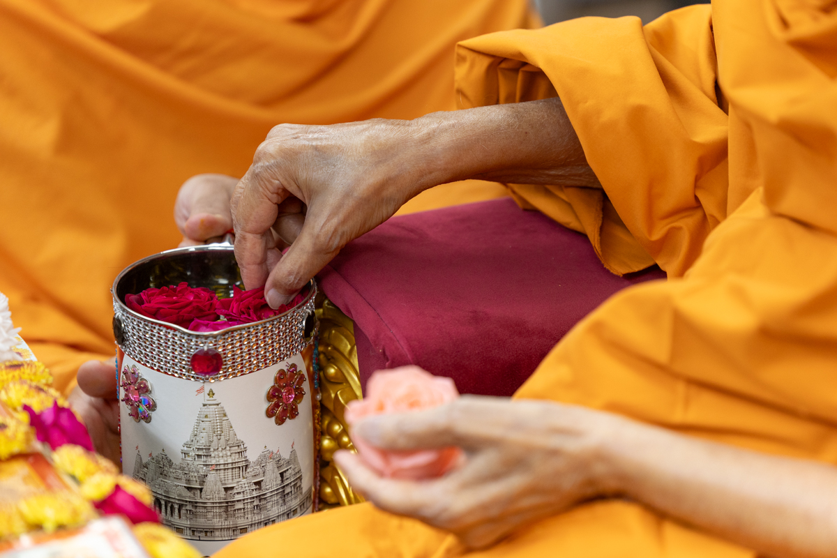 Swamishri adds flowers to the sanctified water