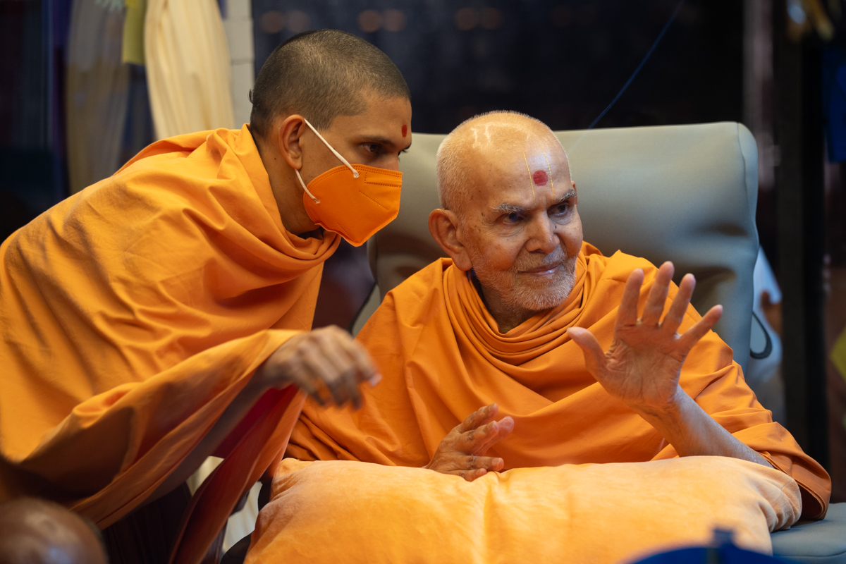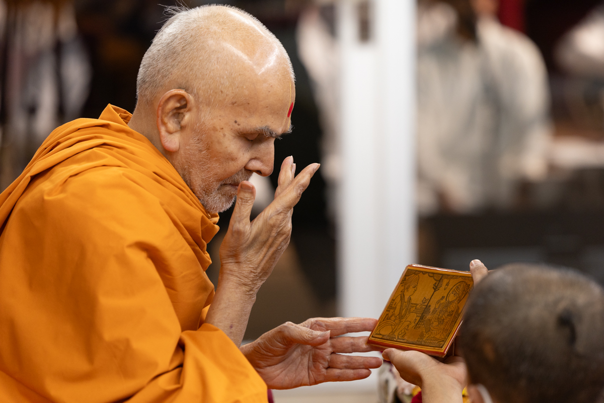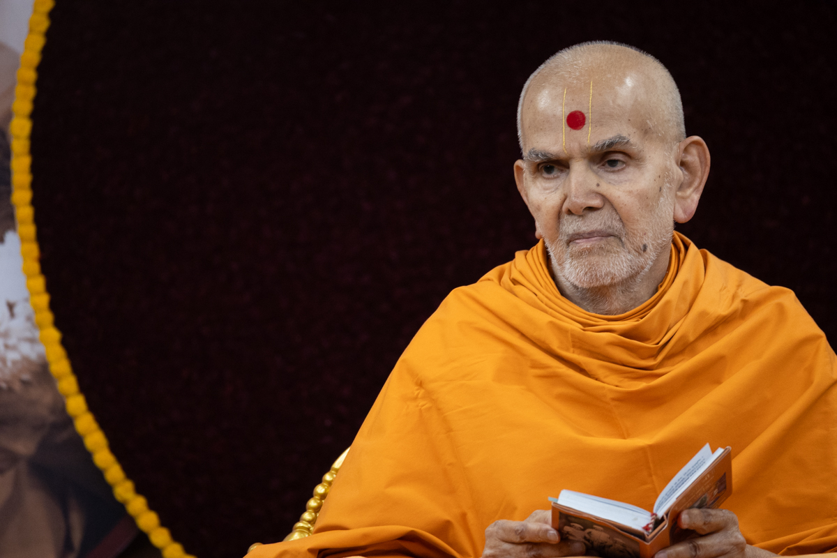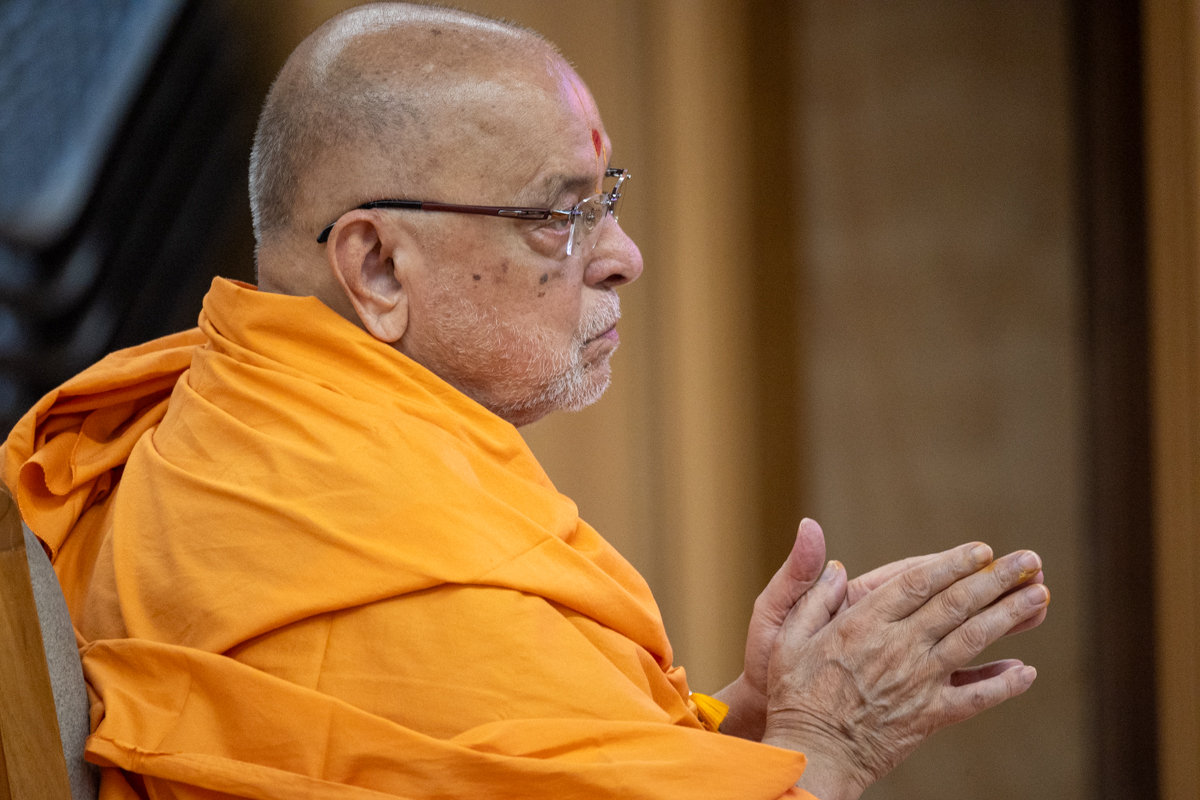 Swamishri listens to the sadhana mantra and daily prayer