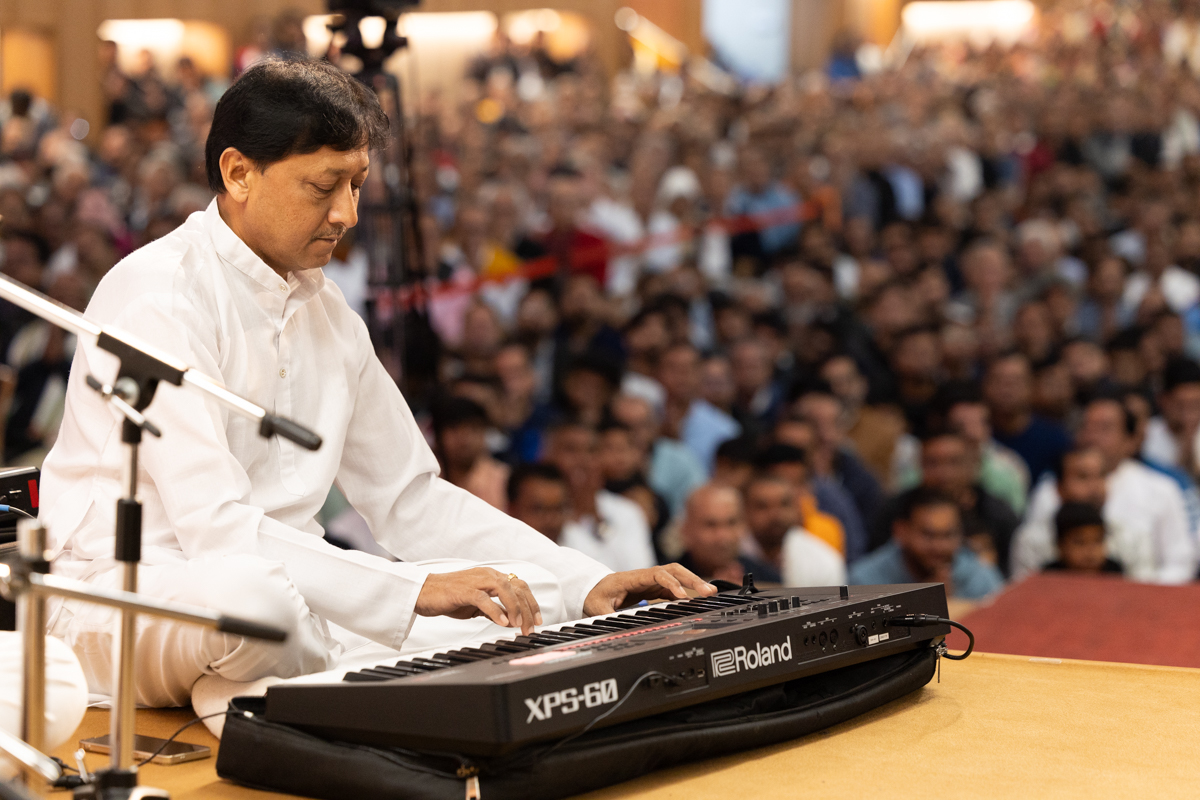 A well-wisher plays the keyboard in Swamishri's daily puja
