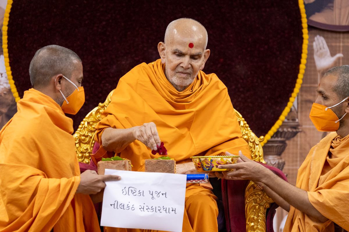 Swamishri sanctifies bricks to start construction at BAPS Shri Swaminarayan Mandir, Nilkanth Sanskardham (Mahesana), India