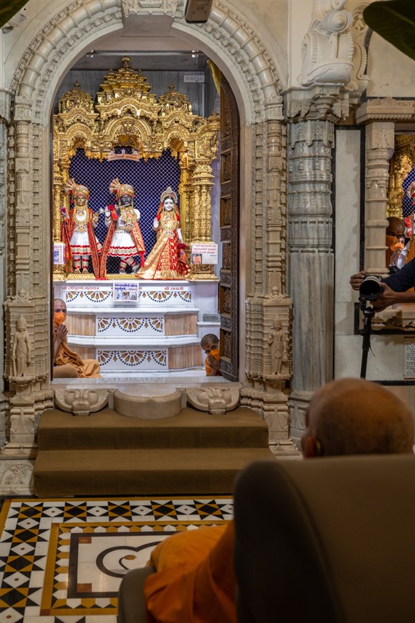 Swamishri engrossed in darshan of Shri Harikrishna Maharaj, Bhagwan Shri Krishna and Shri Radhaji