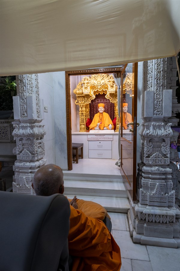 Swamishri engrossed in darshan of Shri Ghanshyam Maharaj in the evening