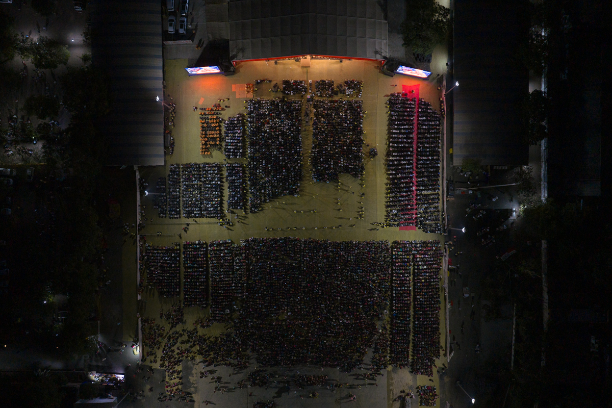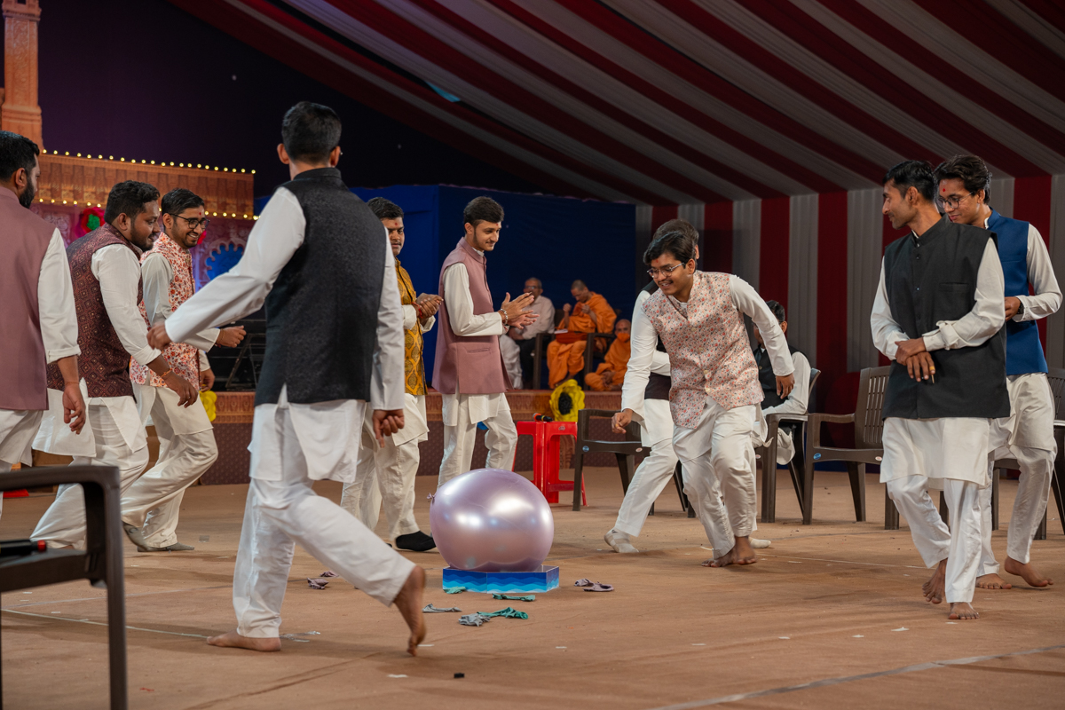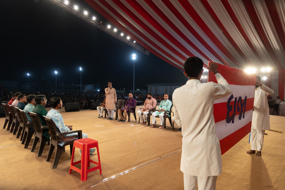 Yuvaks sing kirtans at the beginning of the evening 'Keshav Smruti Din' assembly