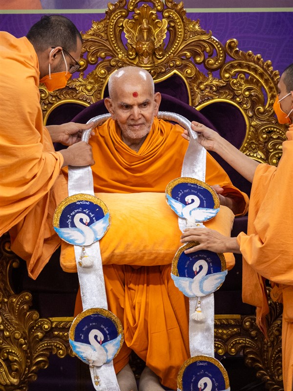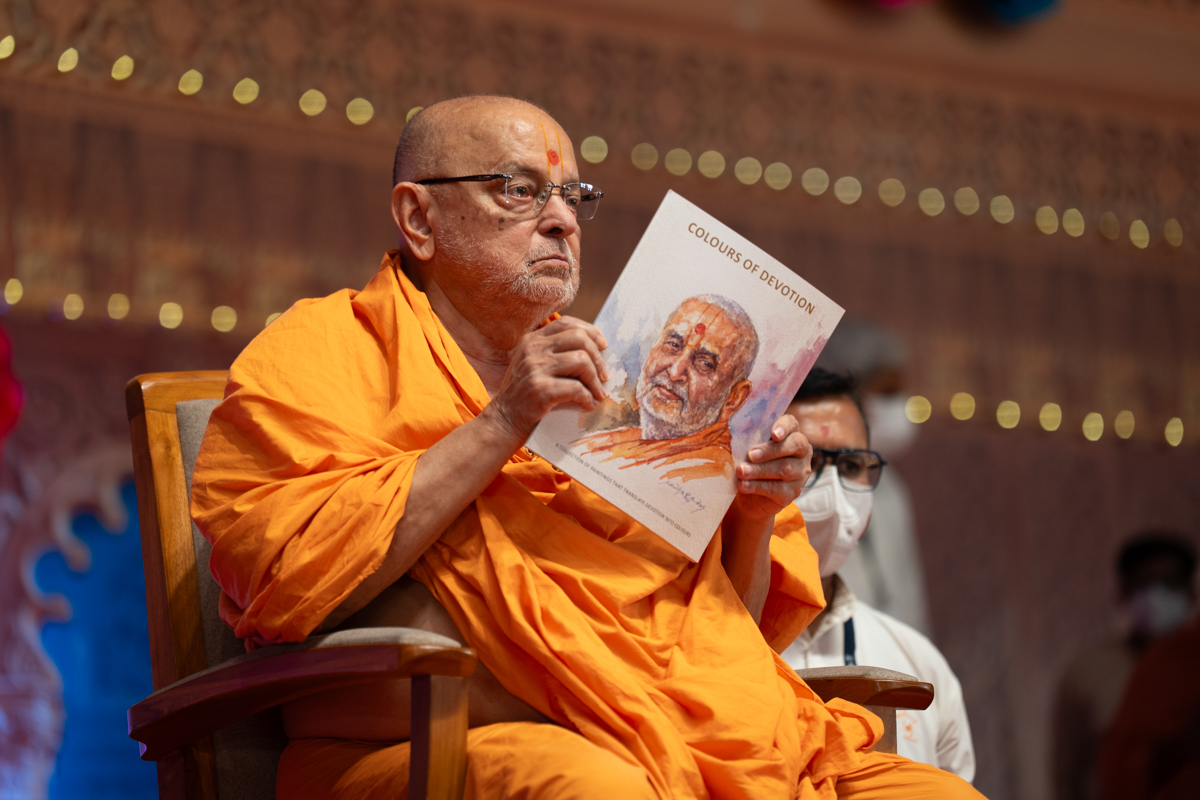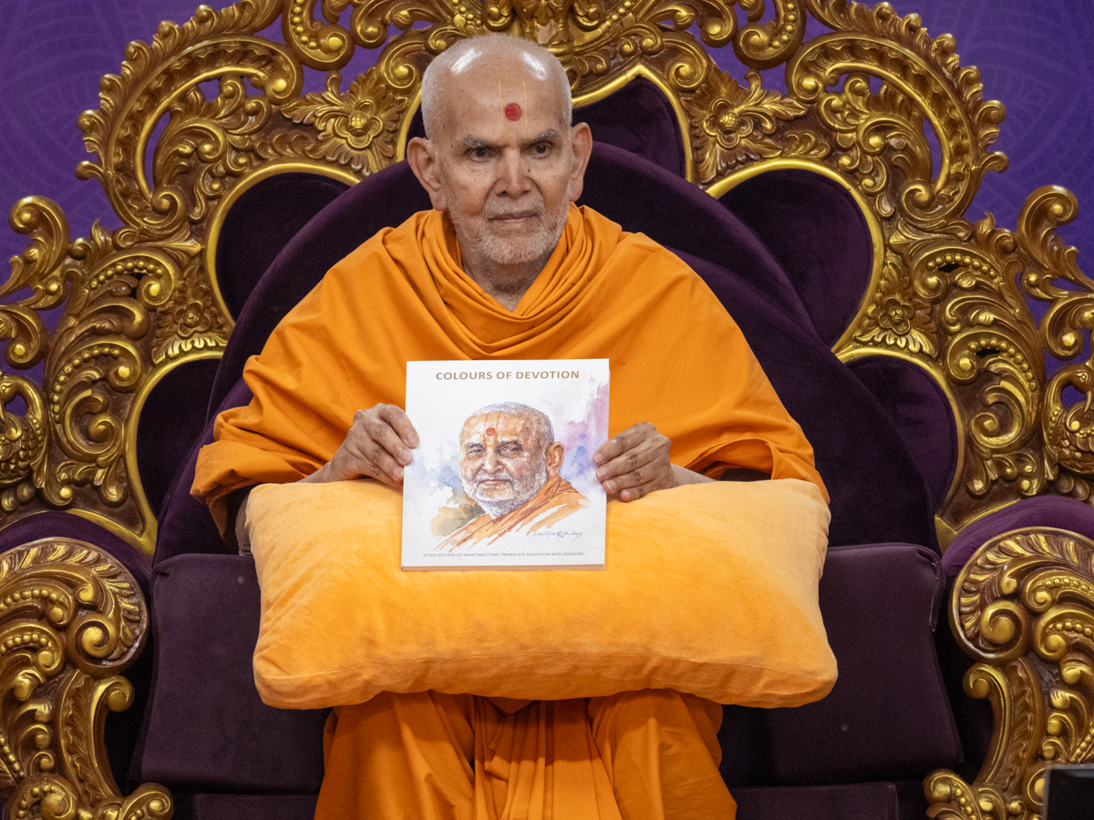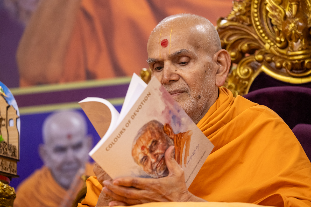 Swamishri displays a message for Dhanurmas