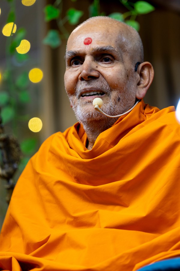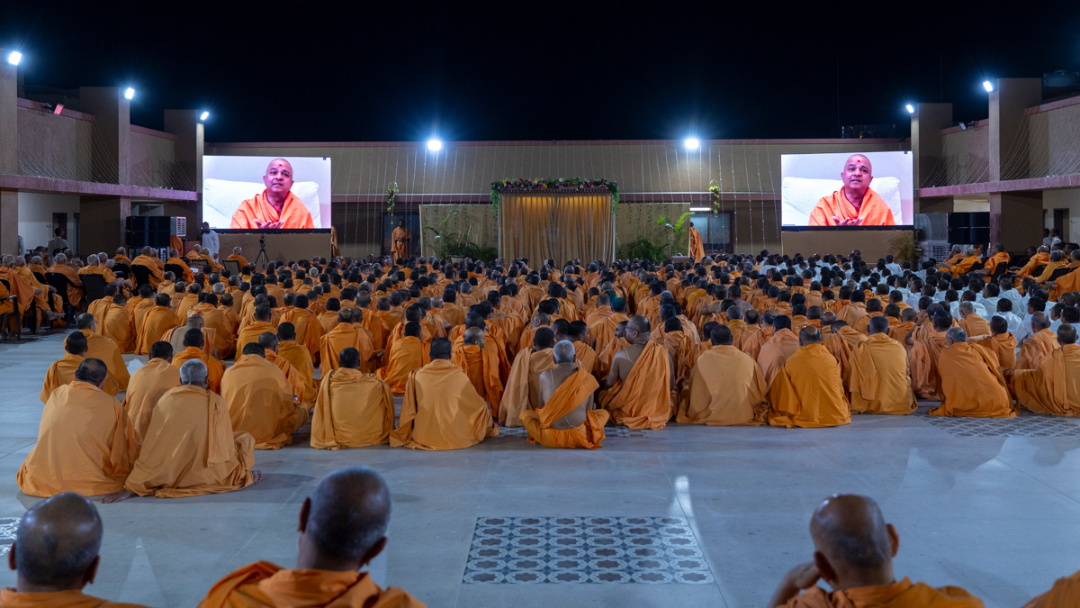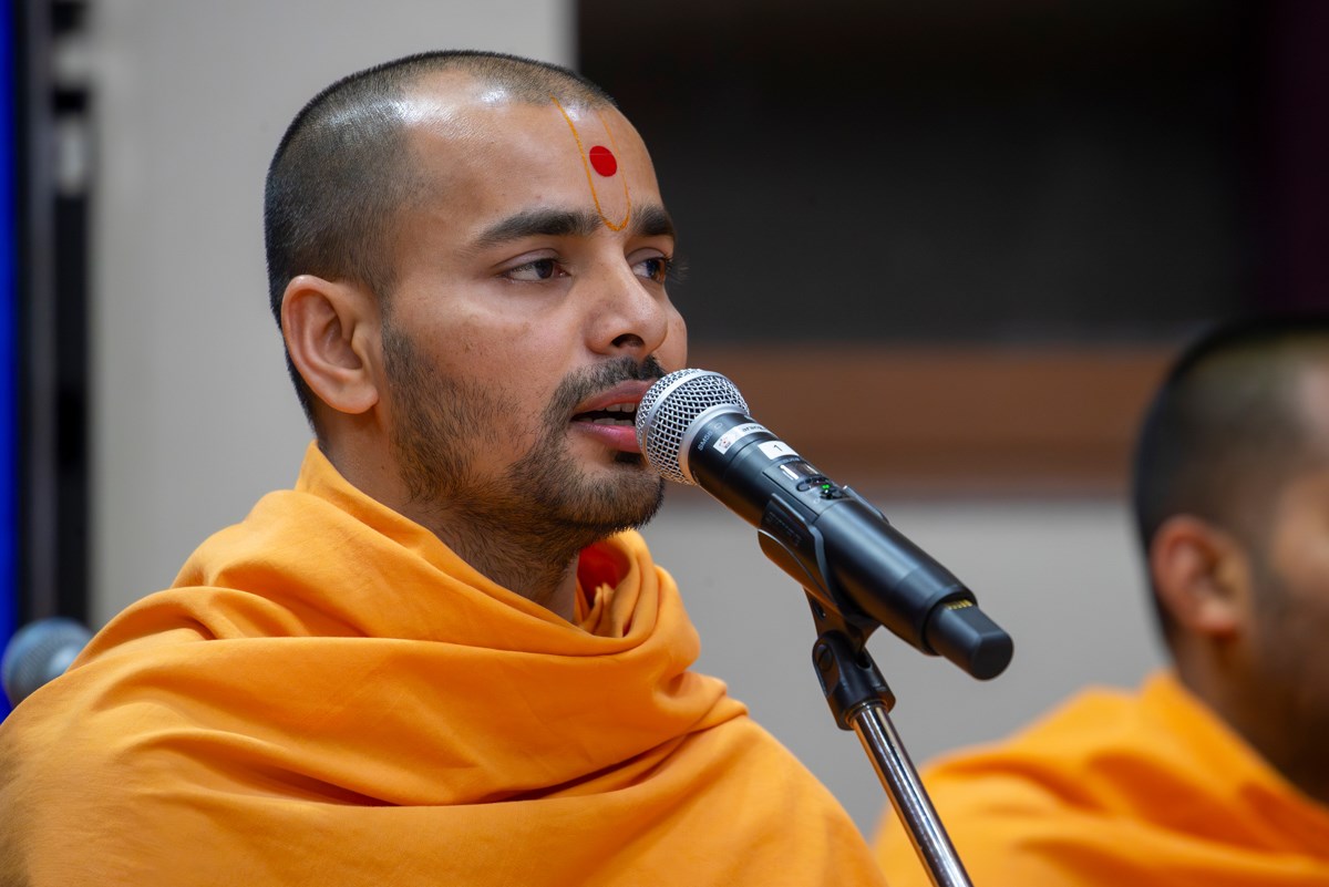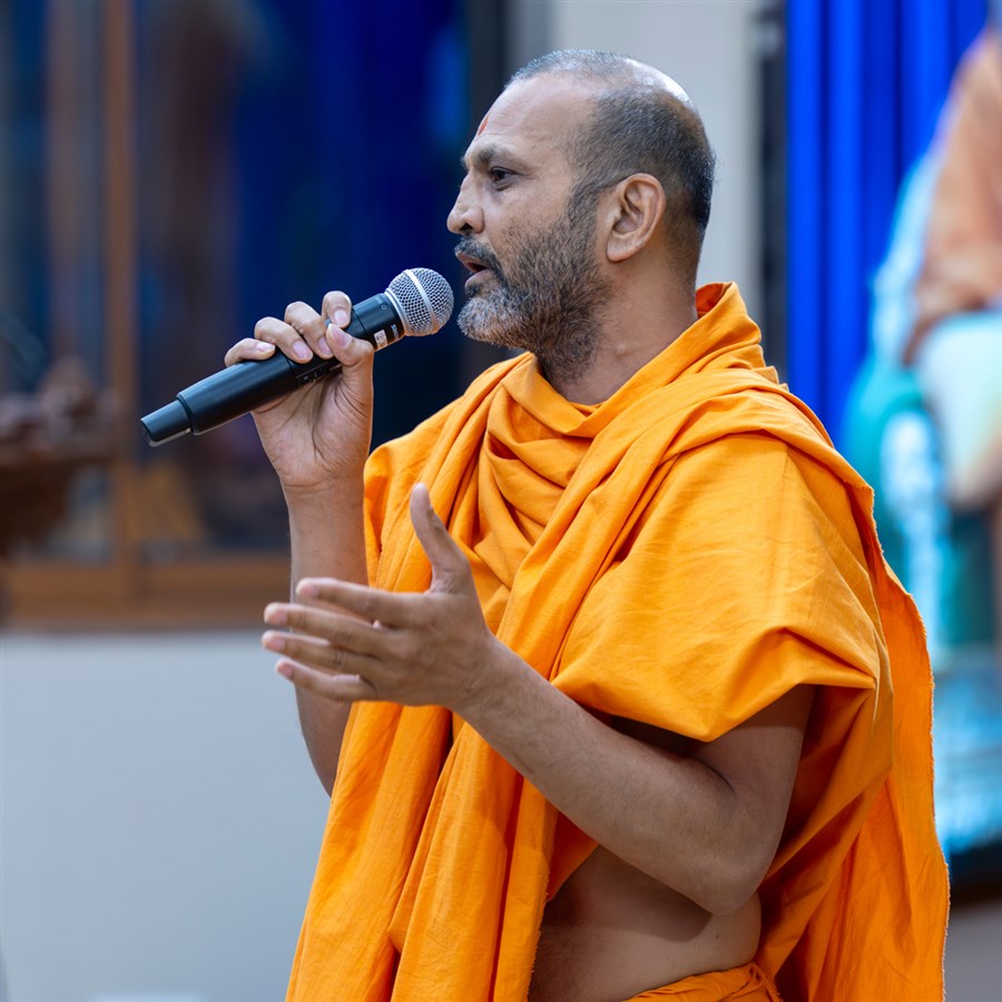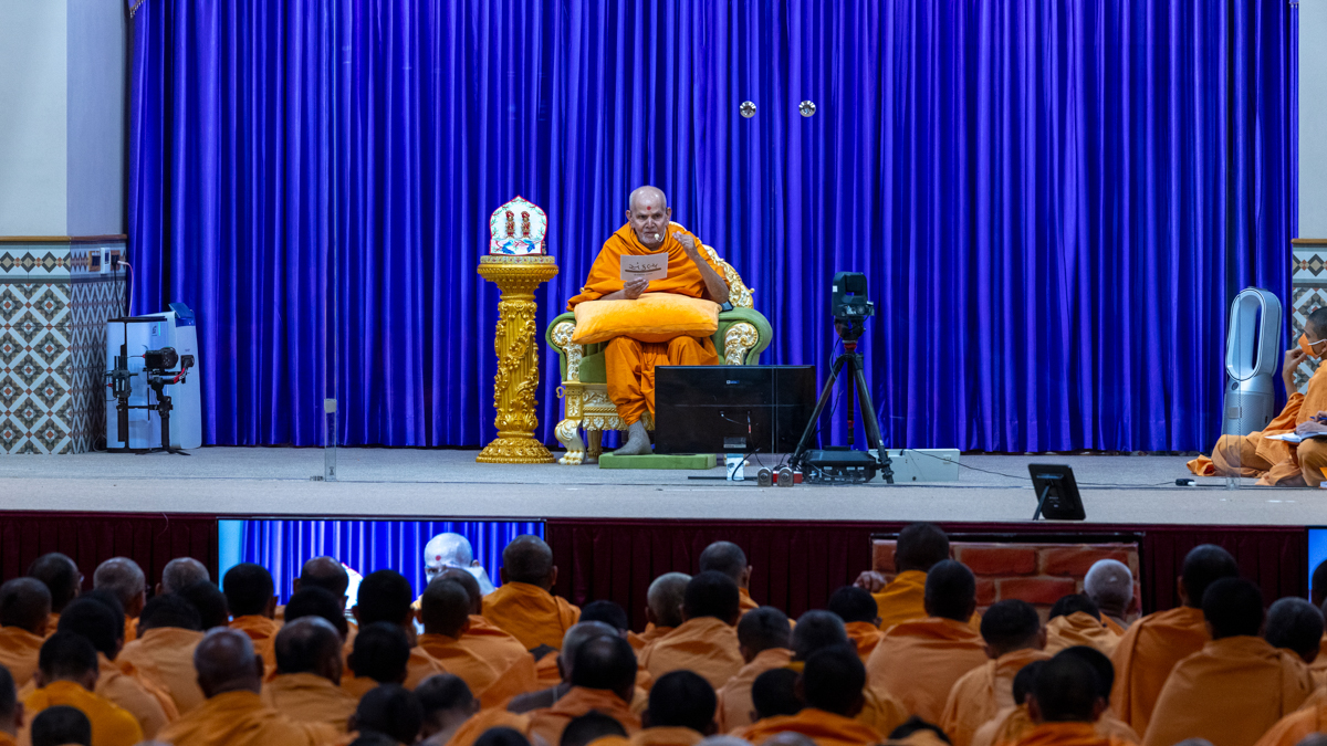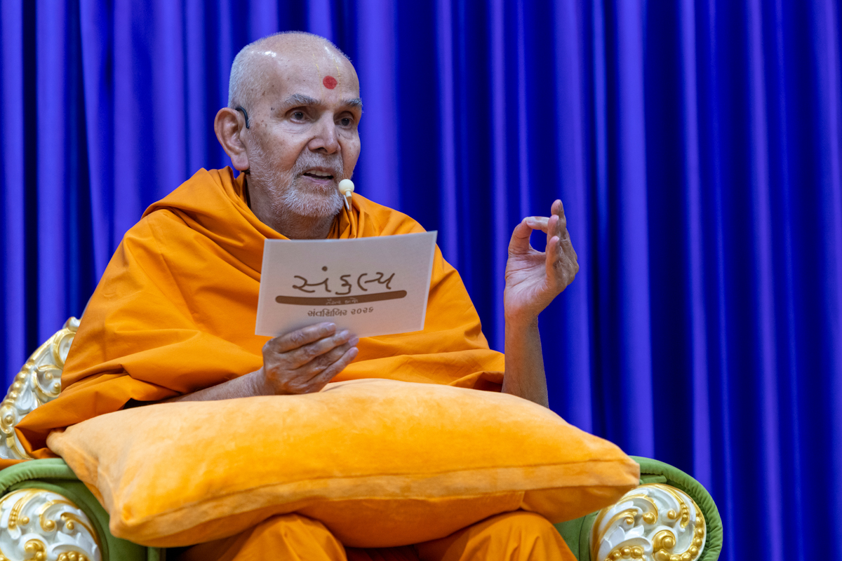 Pujya Ghanshyamcharan Swami addresses a shibir session
