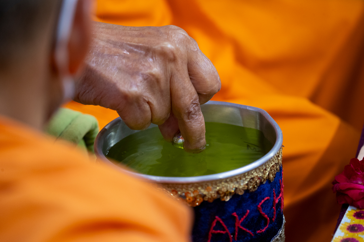 Swamishri sanctifies water with the holy relics of Bhagwan Swaminarayan and the Guru Parampara