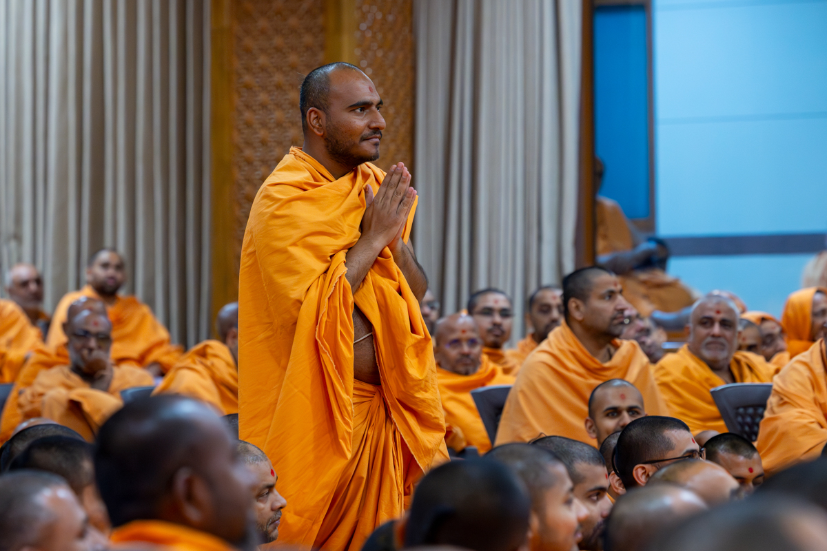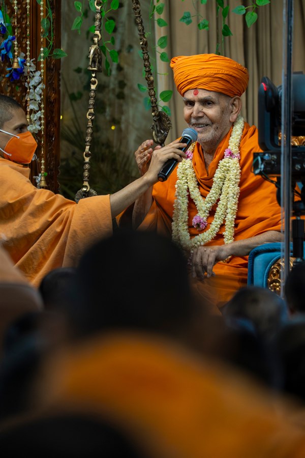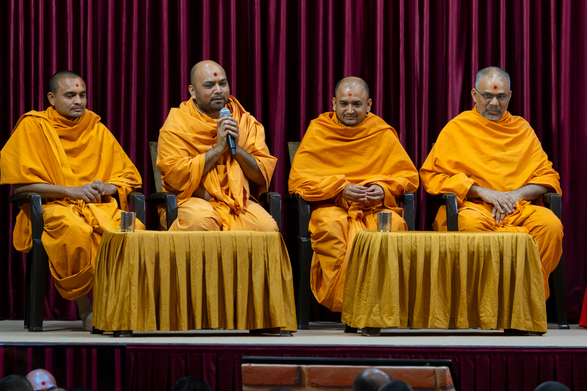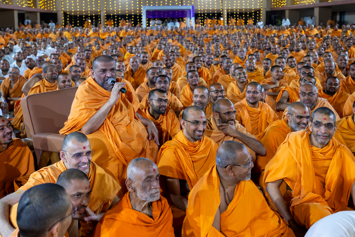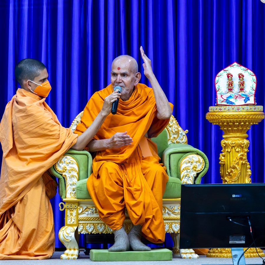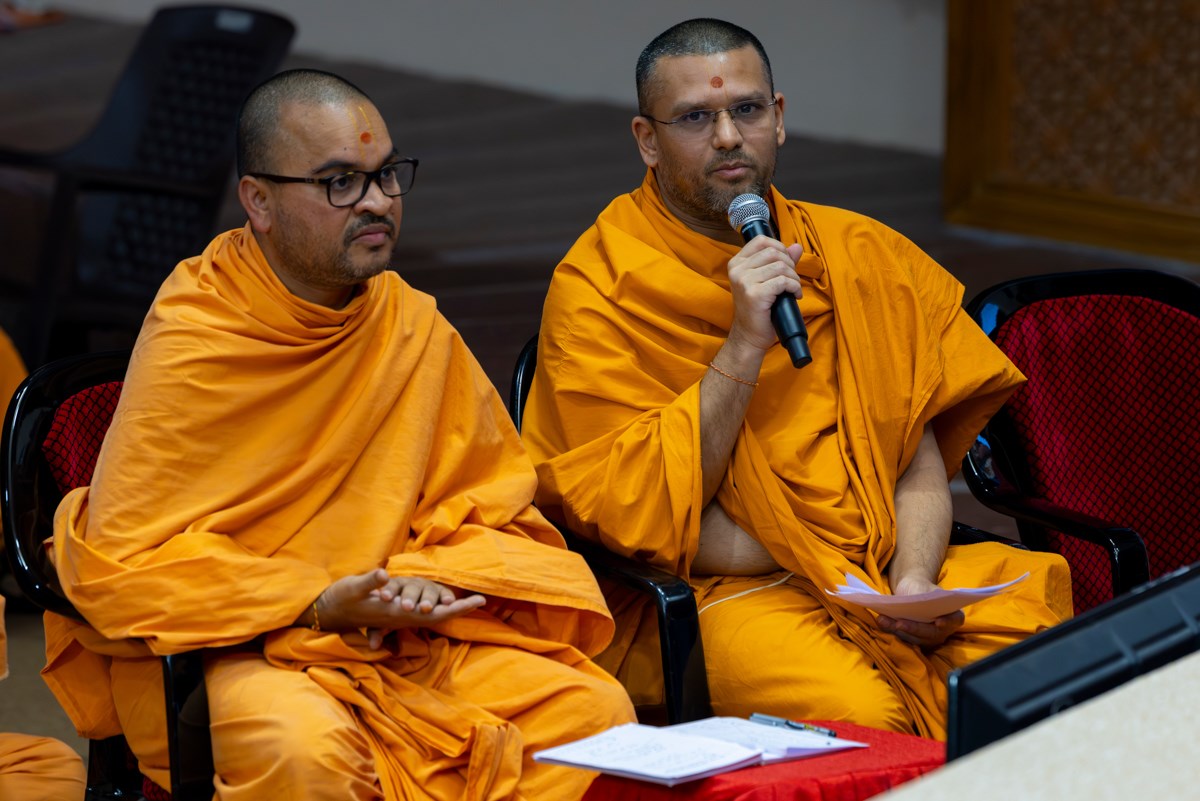 Adarshjivan Swami poses questions to Swamishri during an interactive session
