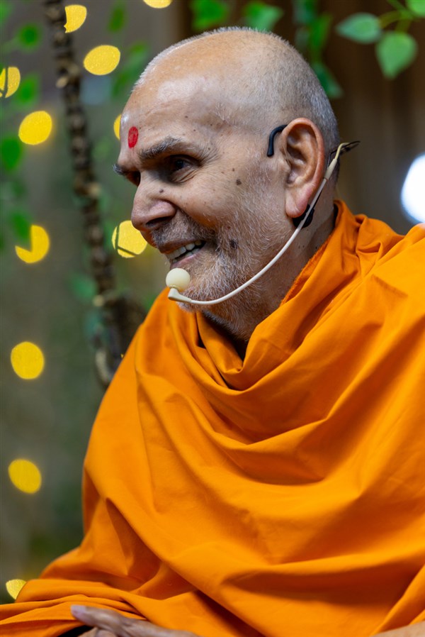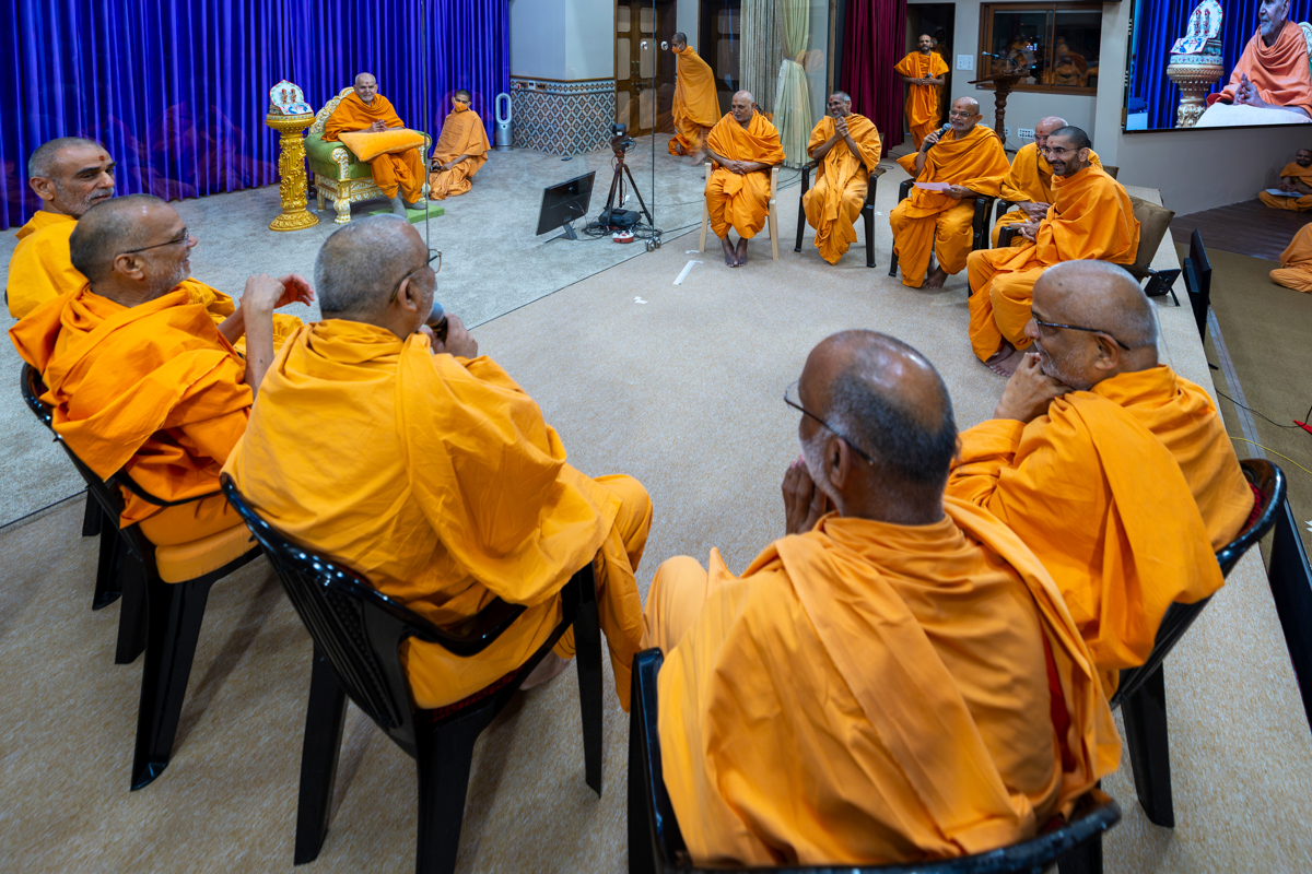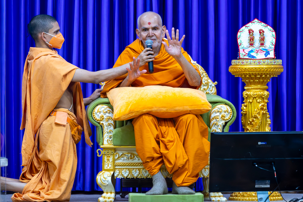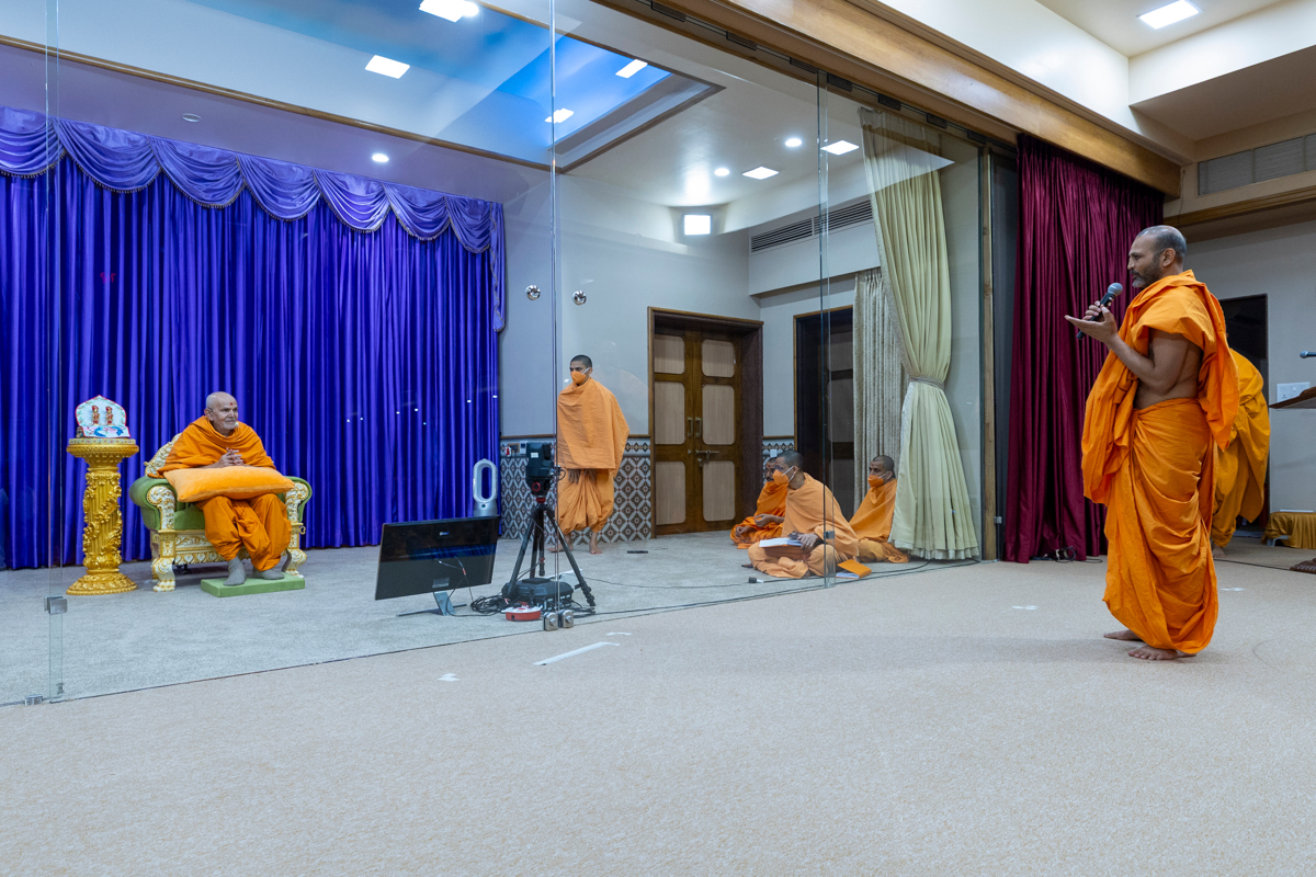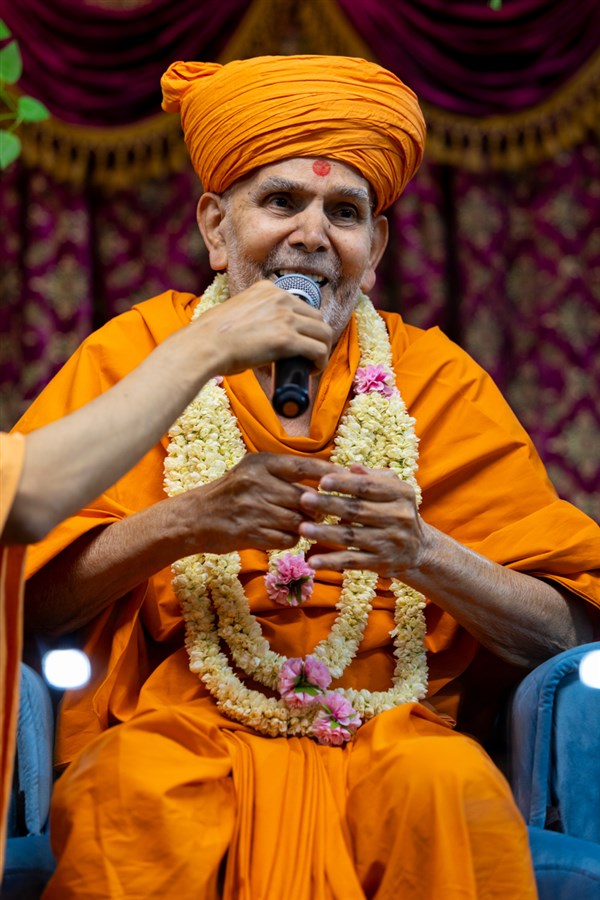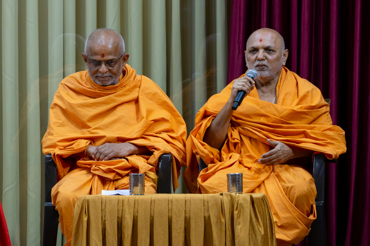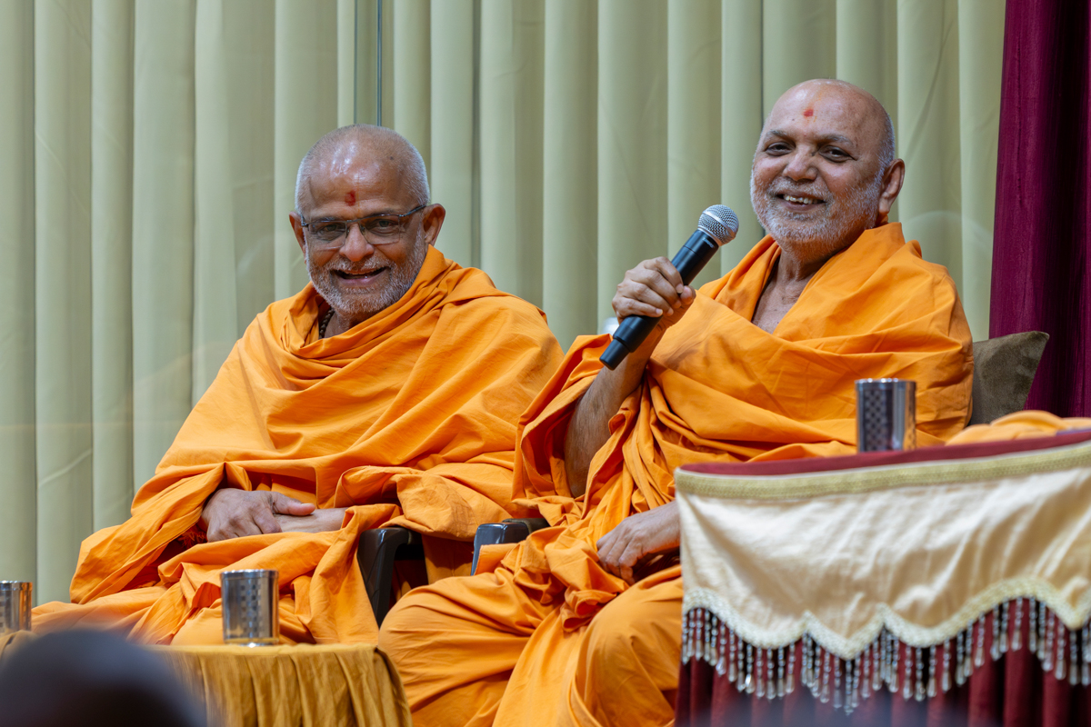 Adarshjivan Swami poses questions to Swamishri during an interactive session