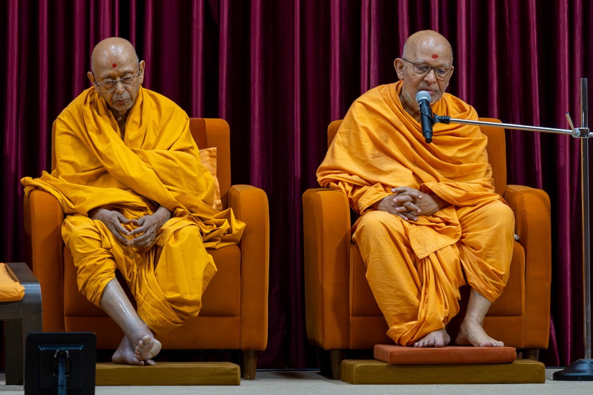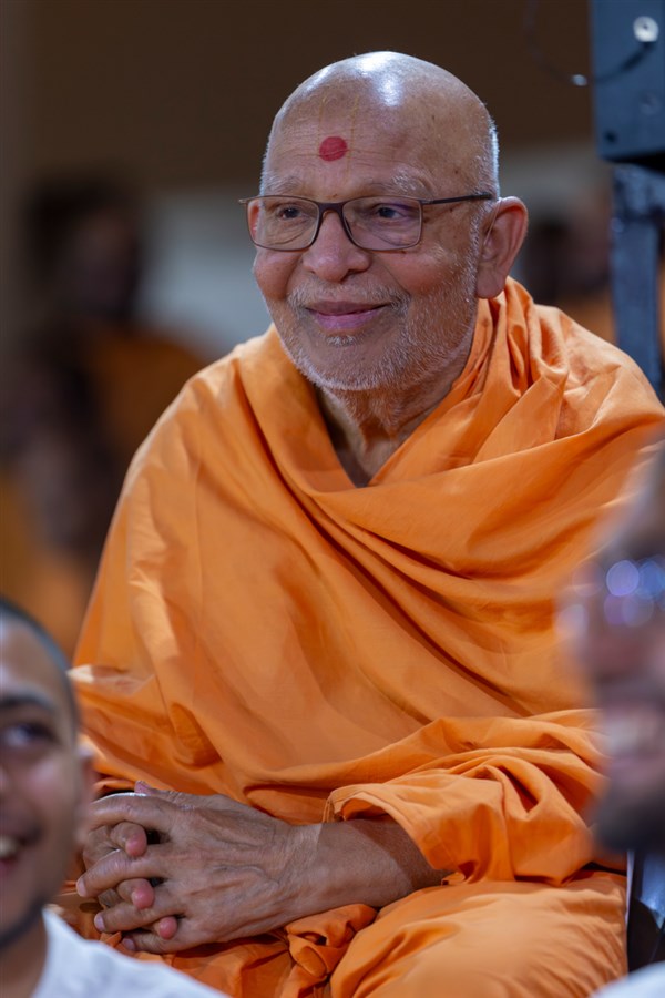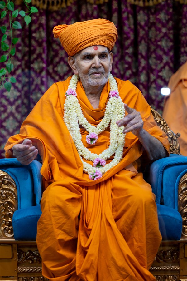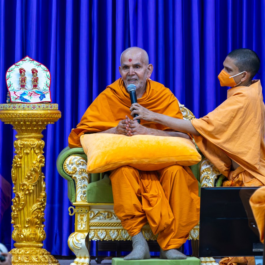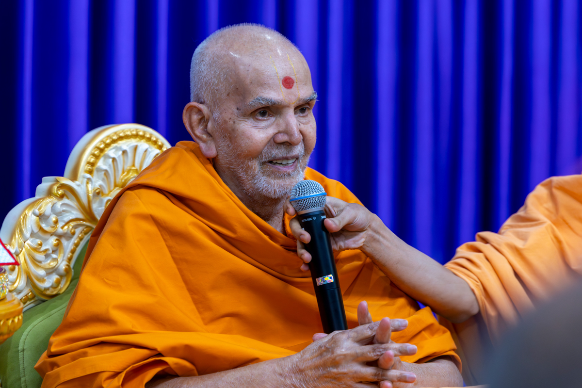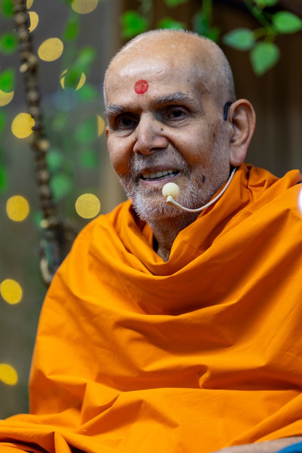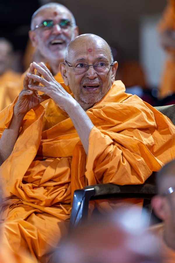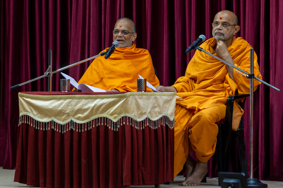 Adarshjivan Swami poses questions to Swamishri during an interactive session