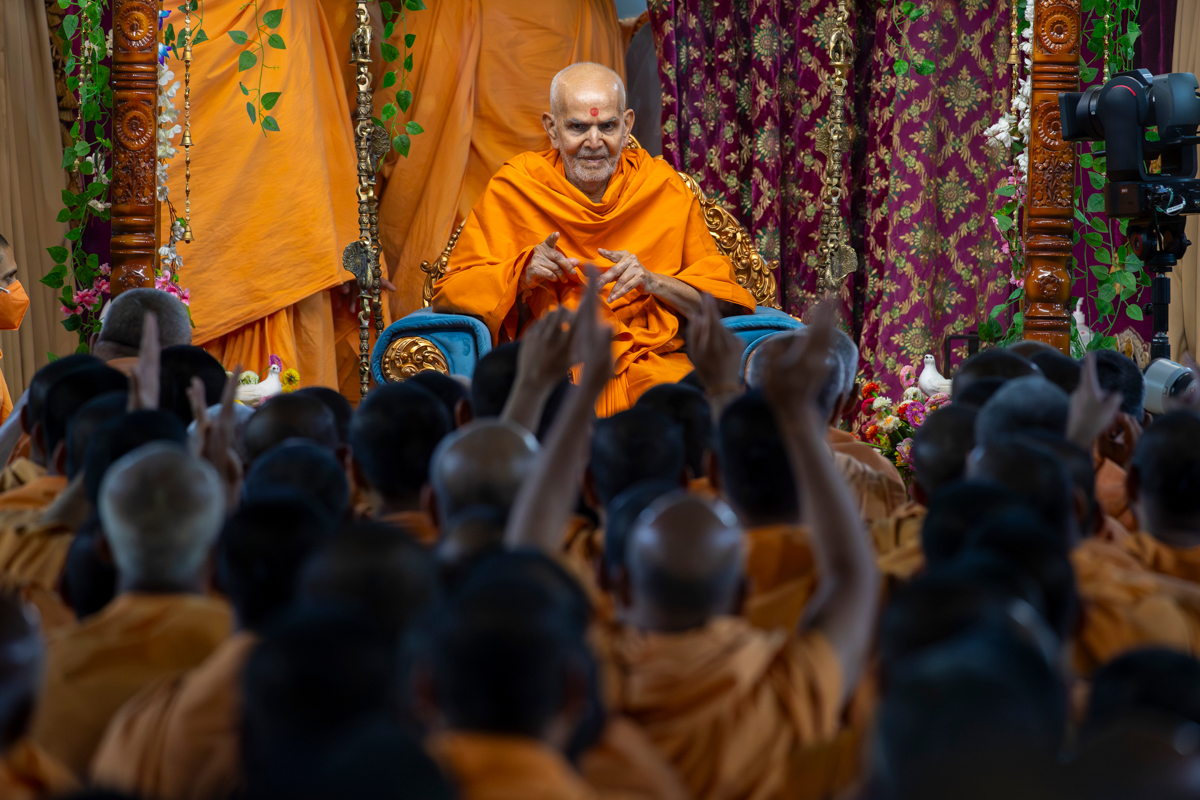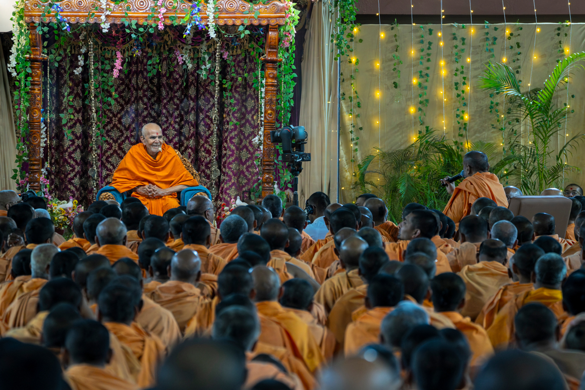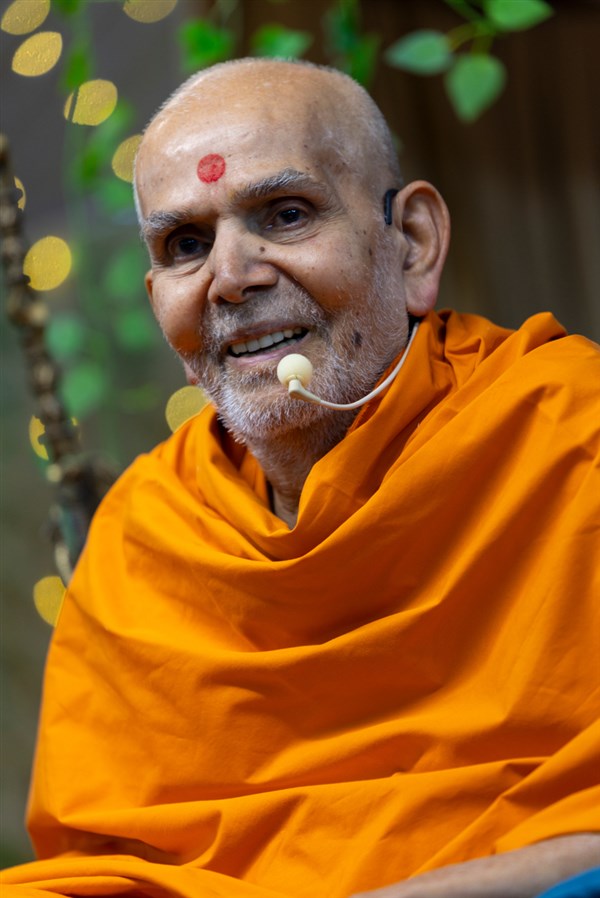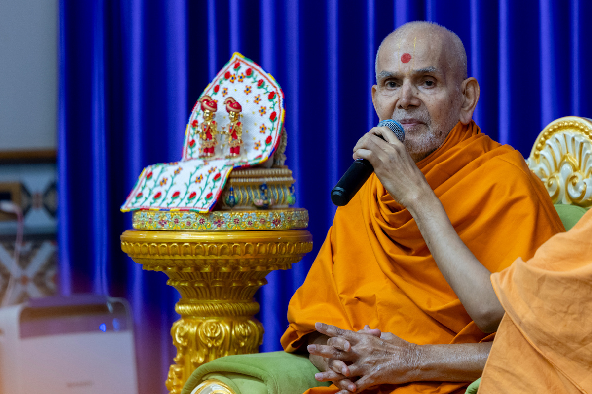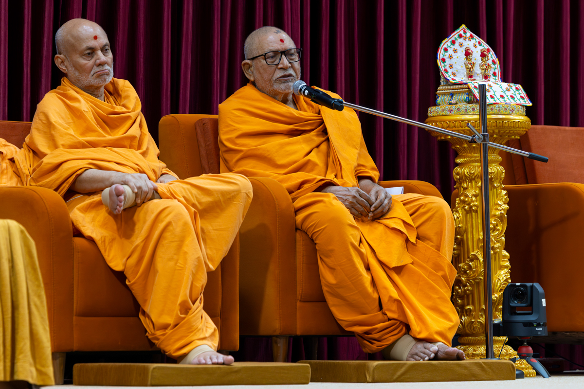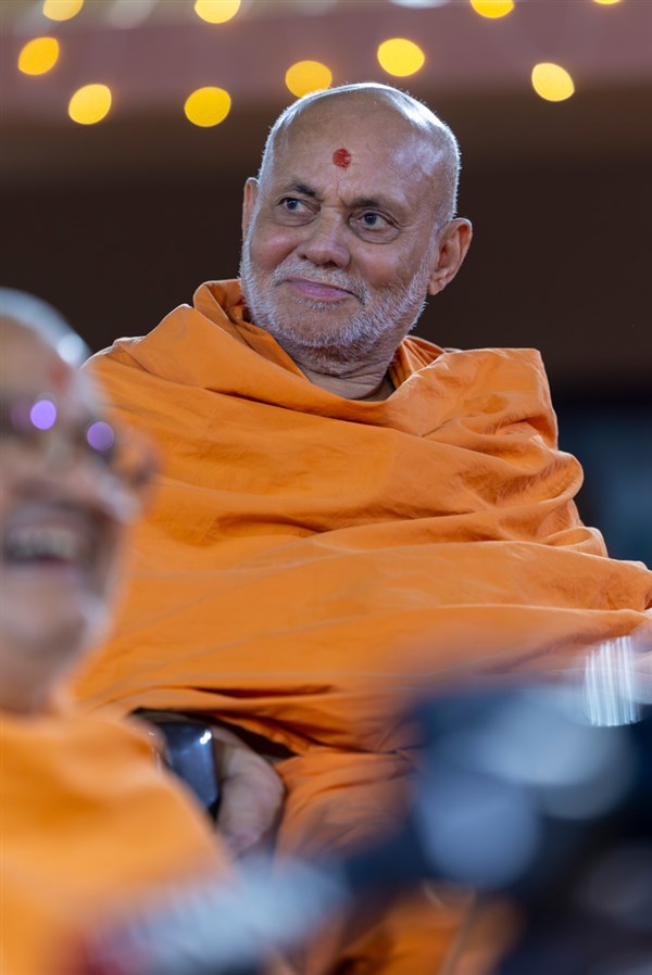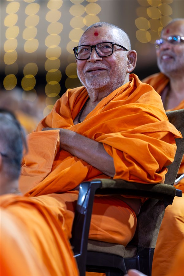 Adarshjivan Swami poses questions to Swamishri during an interactive session