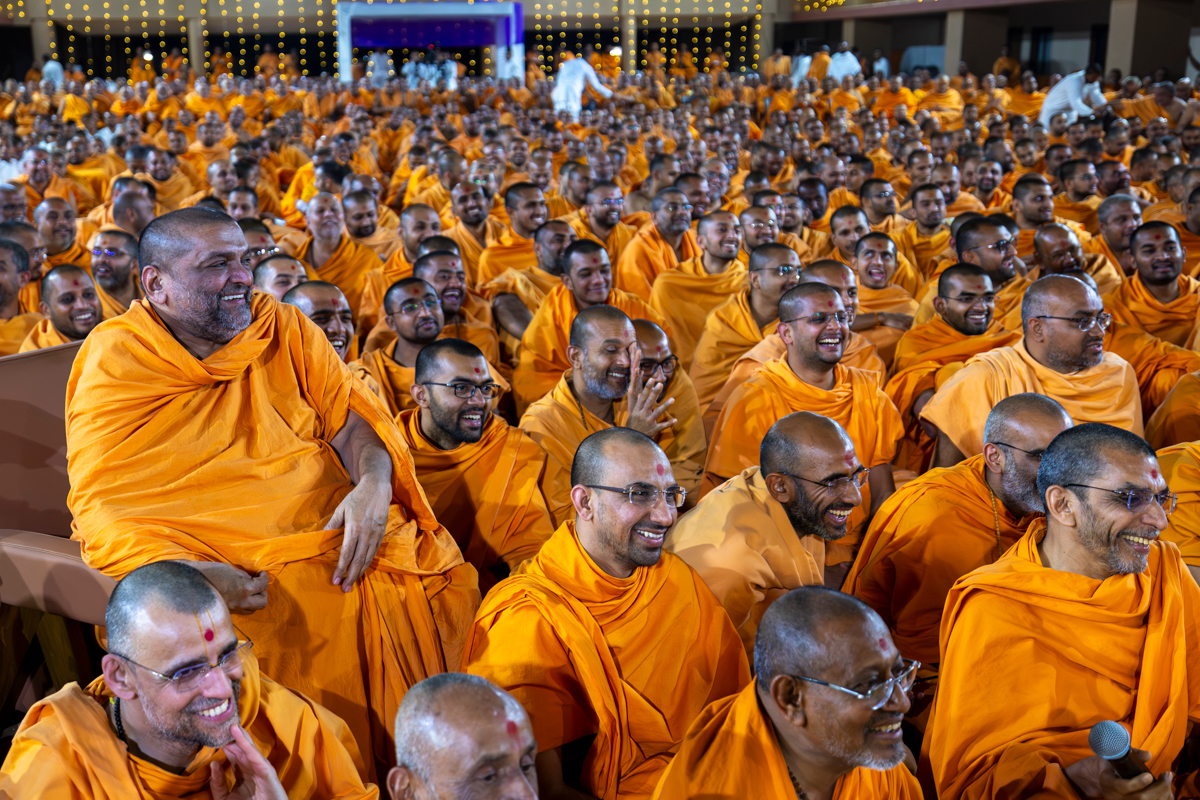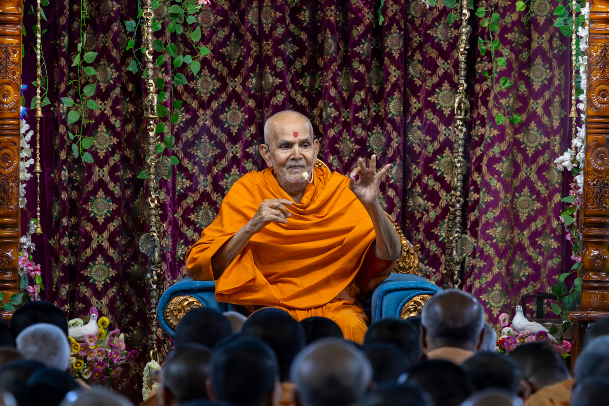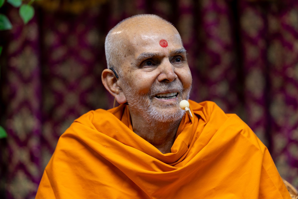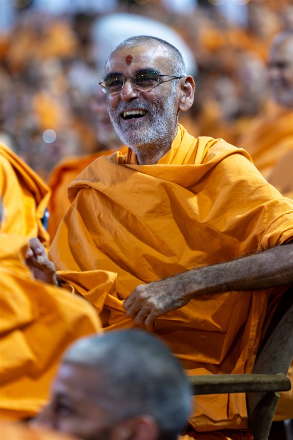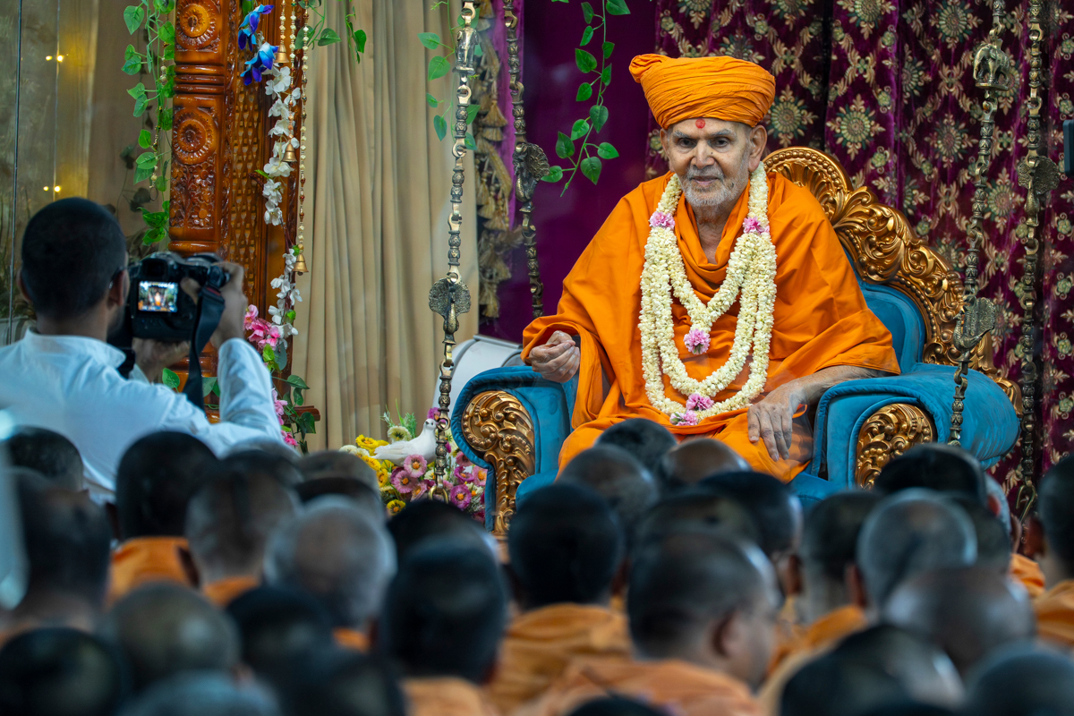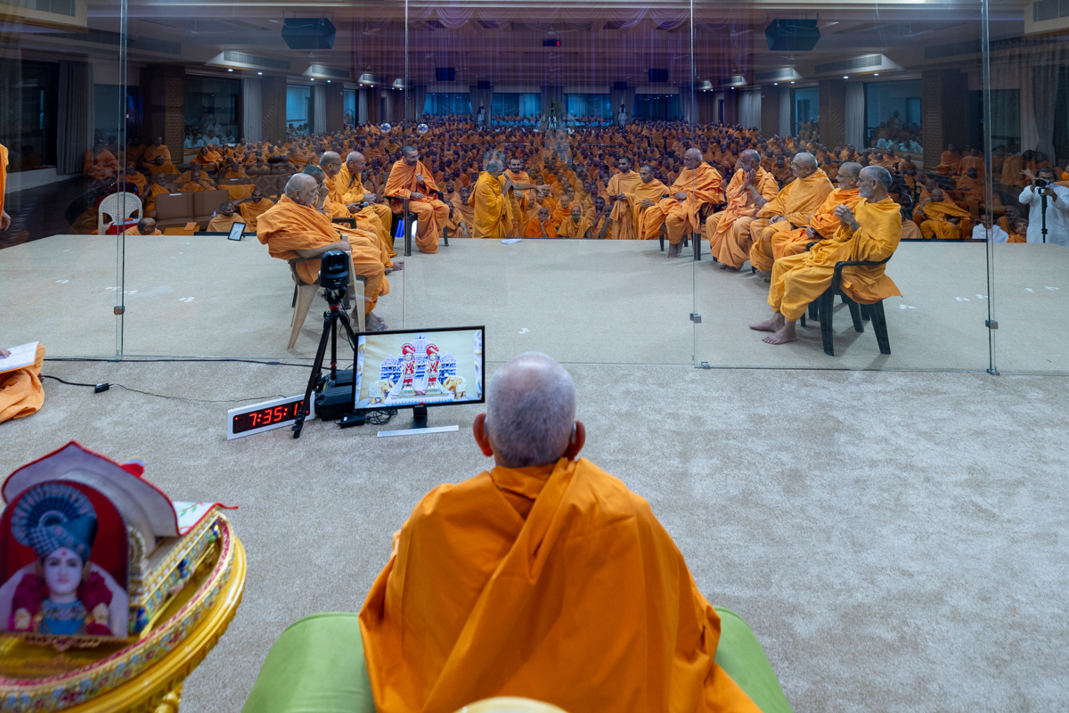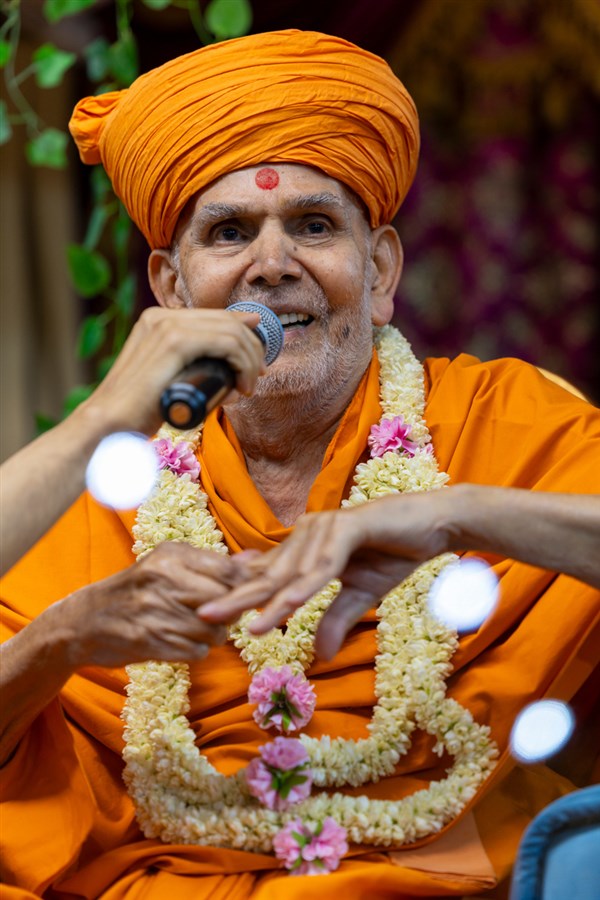 Adarshjivan Swami poses questions to Swamishri during an interactive session