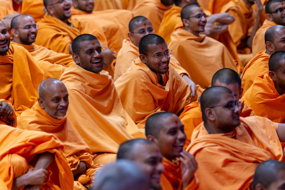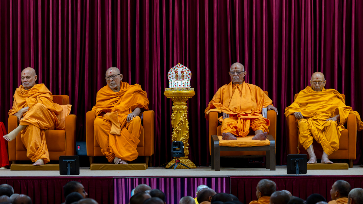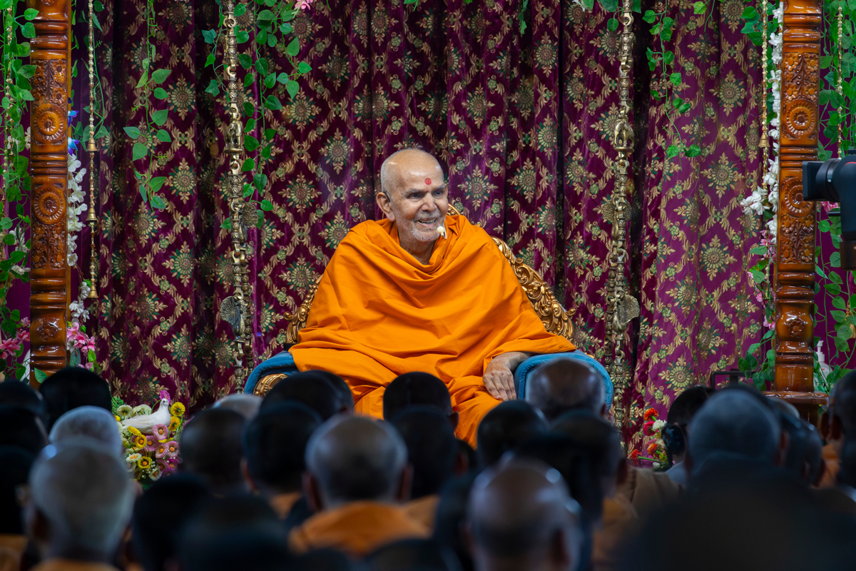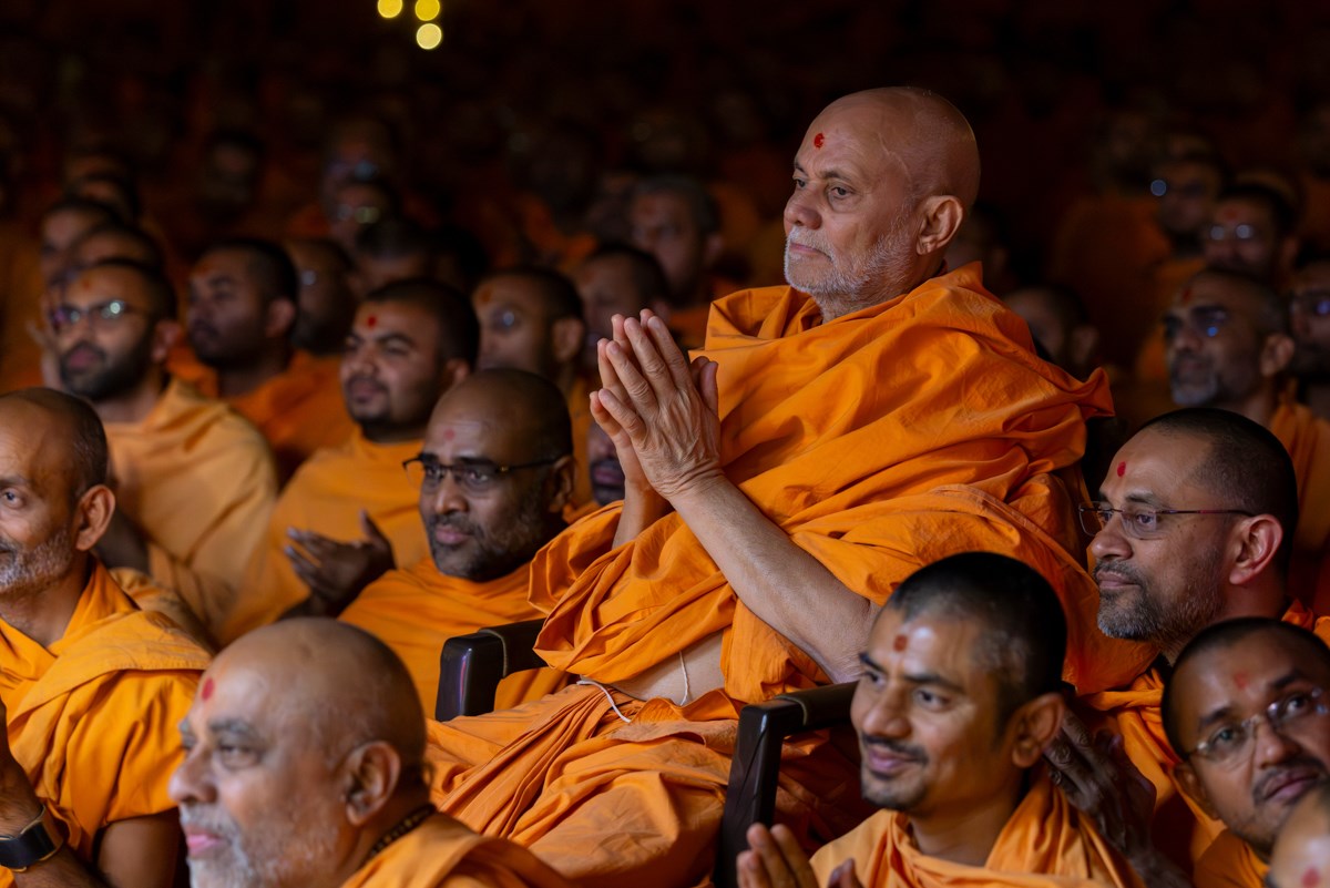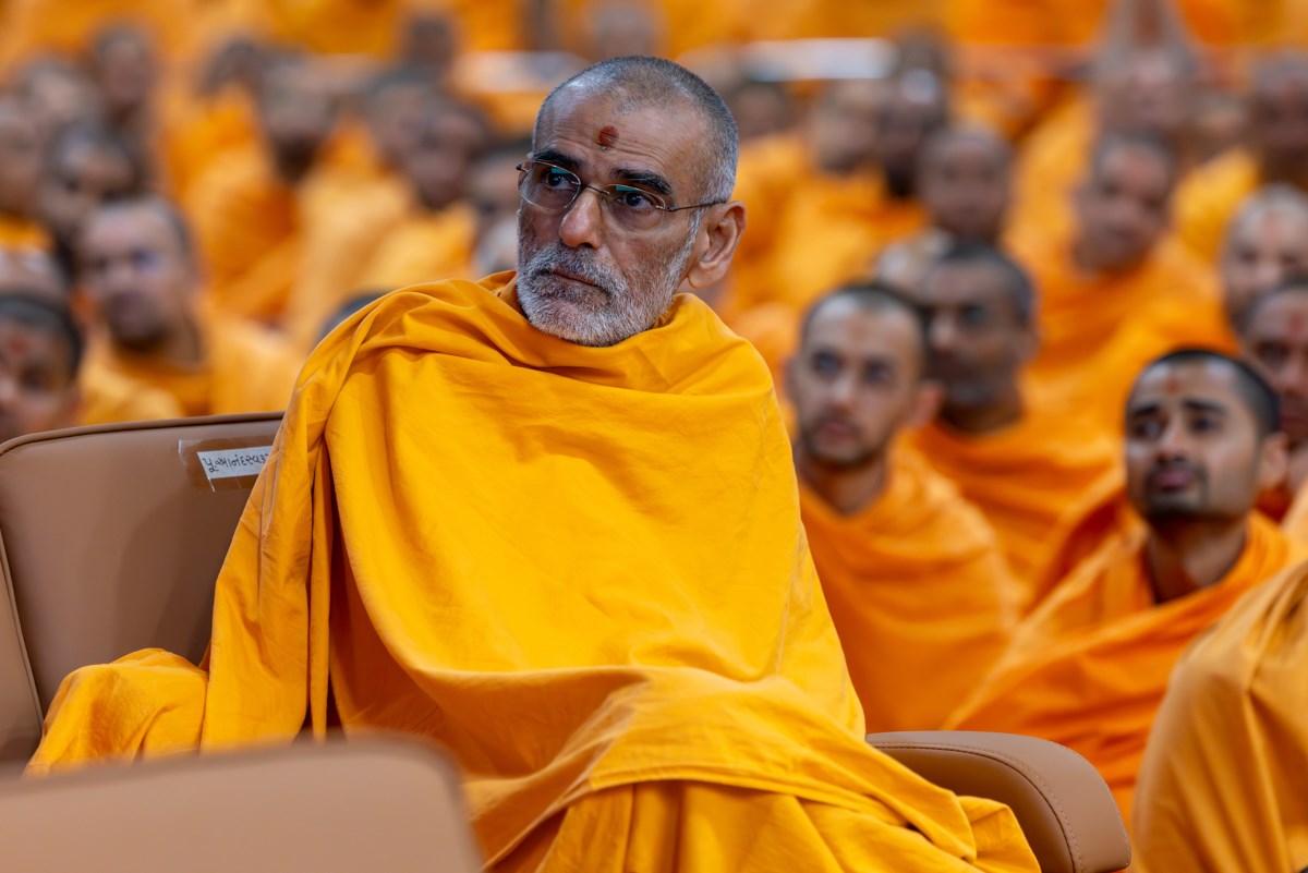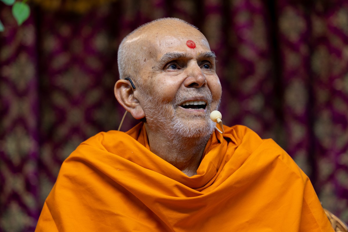 Adarshjivan Swami poses questions to Swamishri during an interactive session