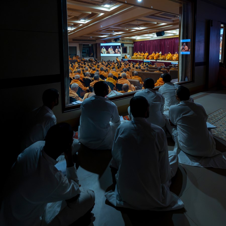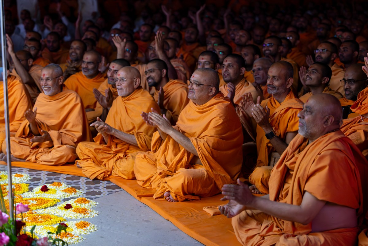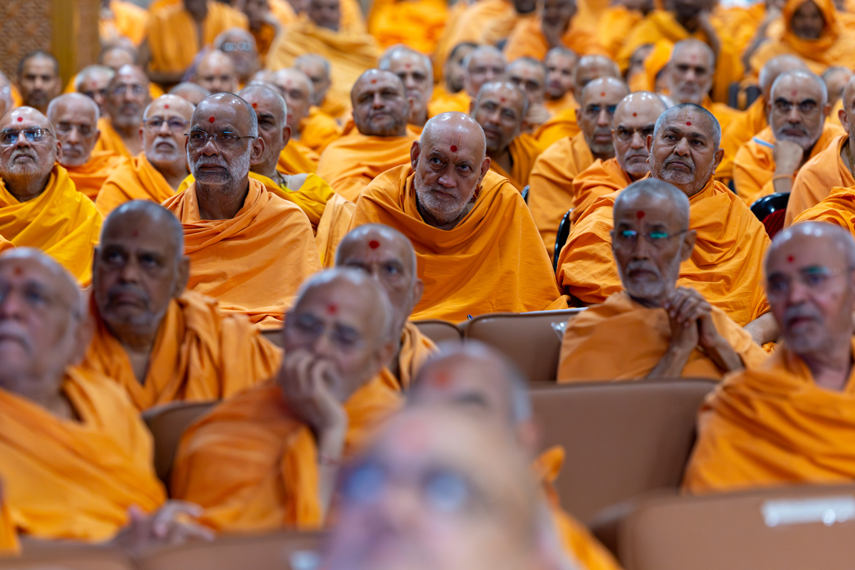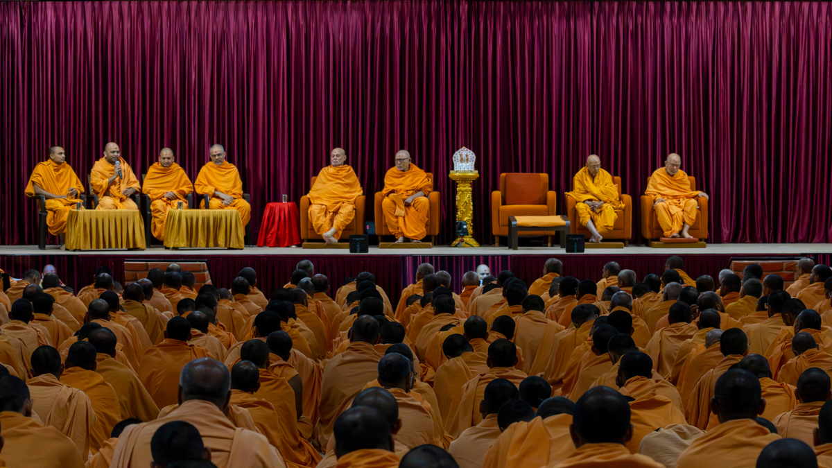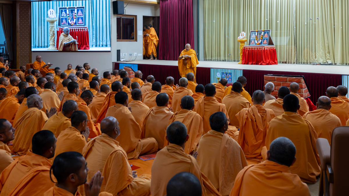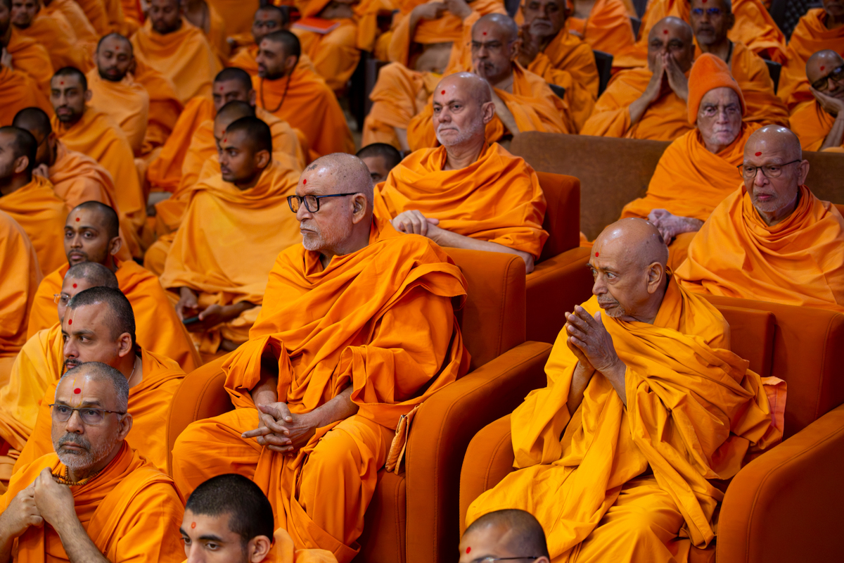 Adarshjivan Swami poses questions to Swamishri during an interactive session