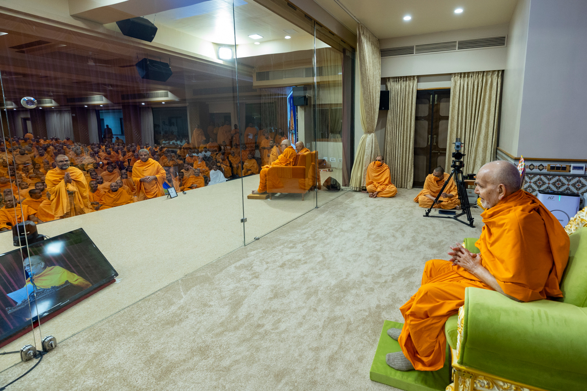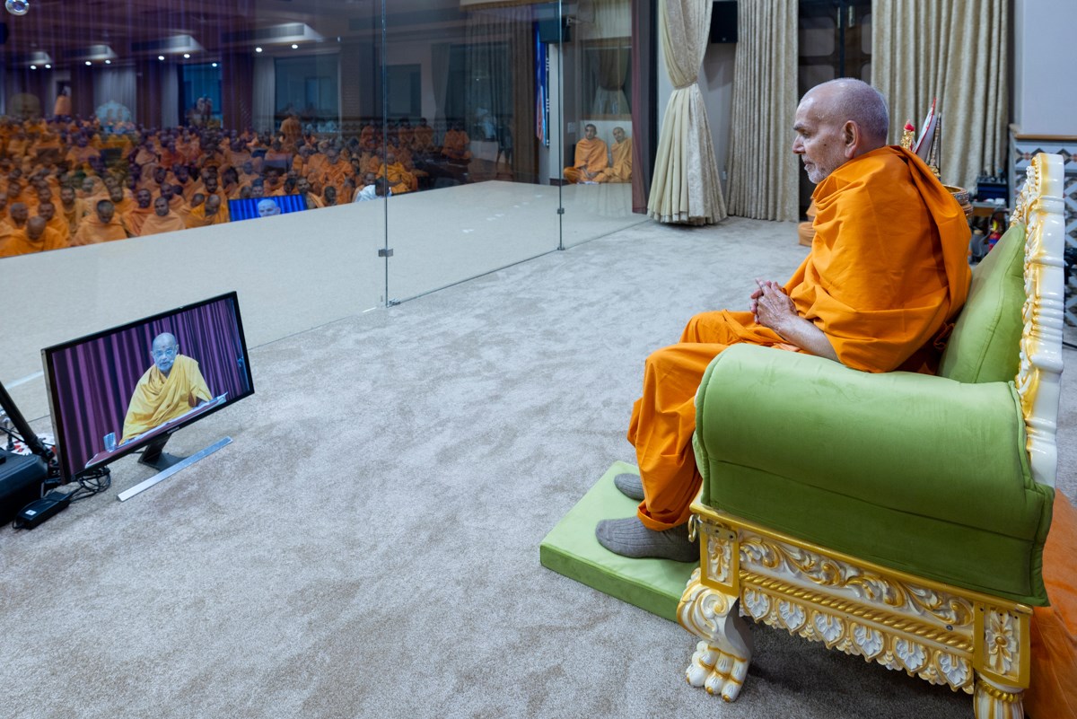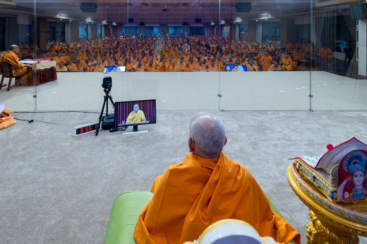 Pujya Ishwarcharan Swami addresses a shibir session via video conference