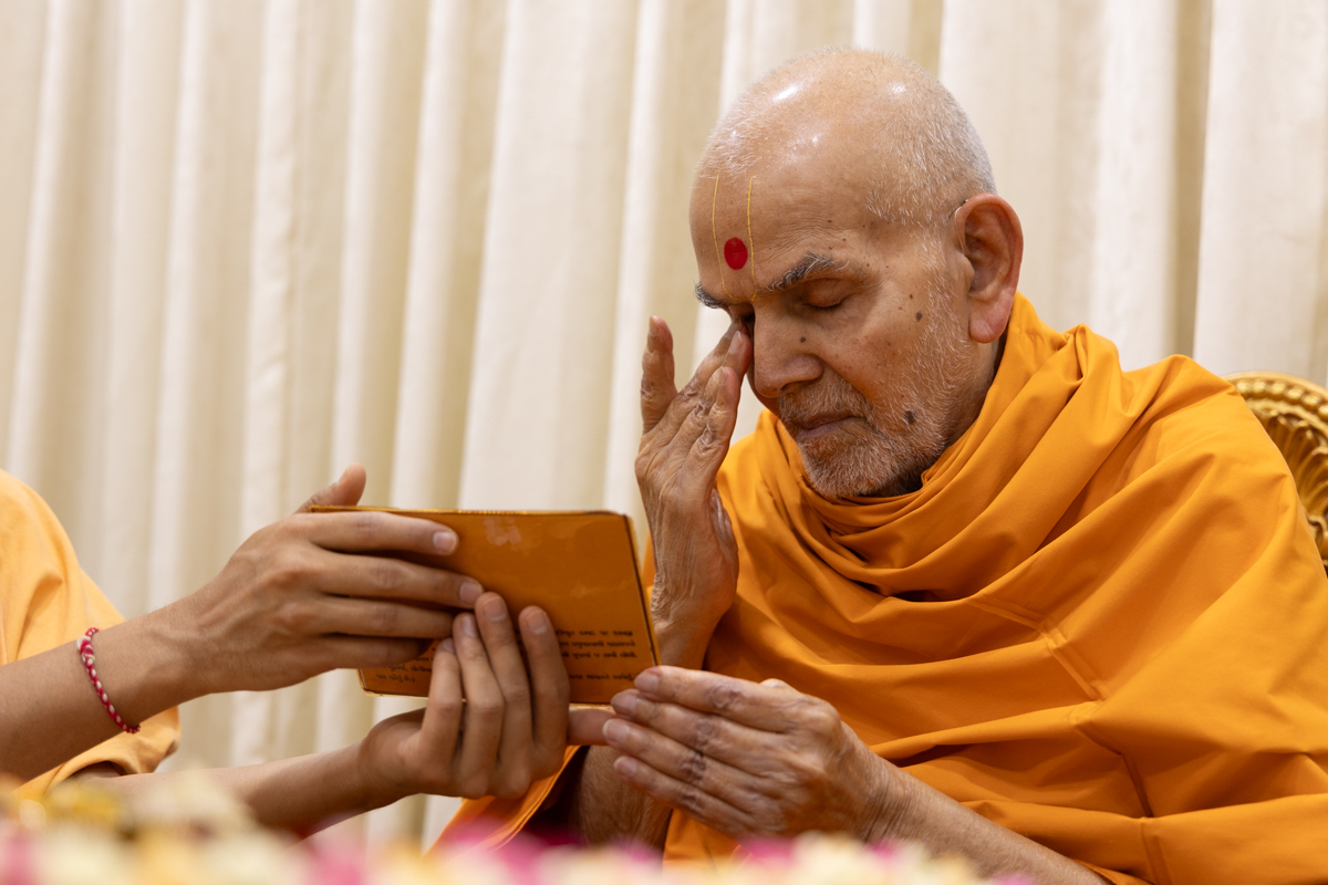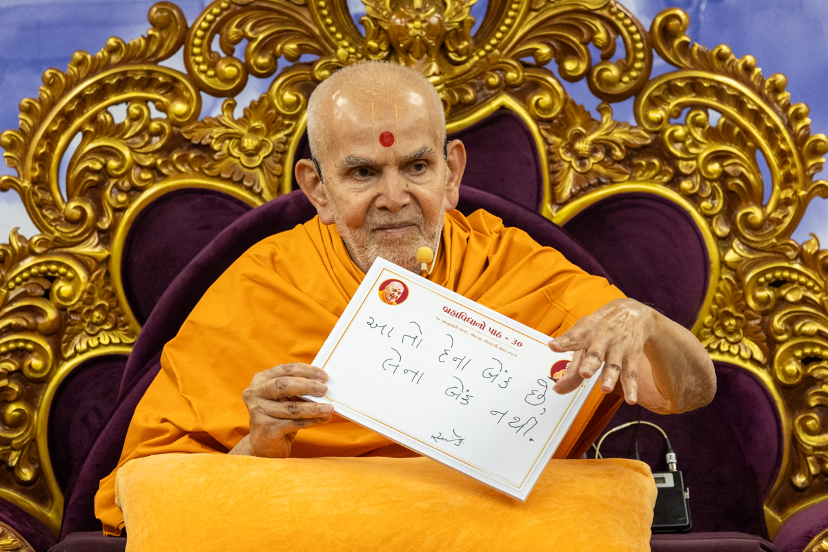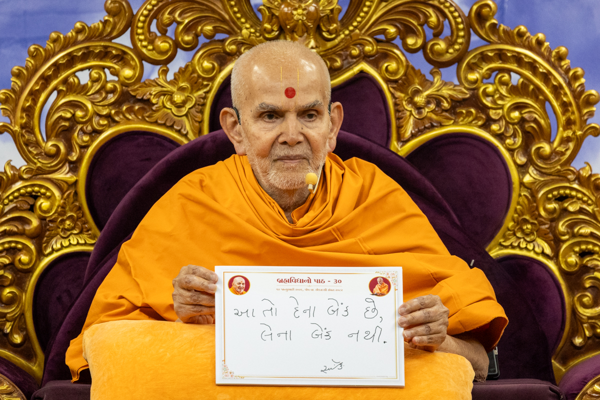 Swamishri displays a message for Dhanurmas